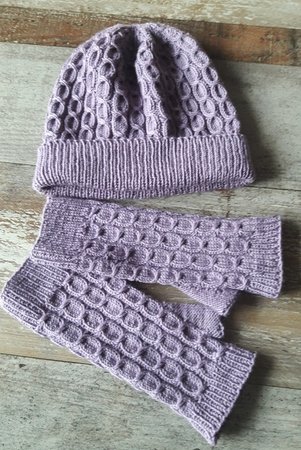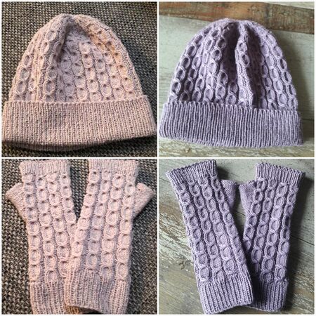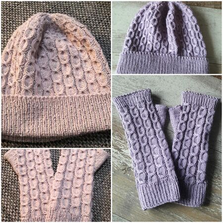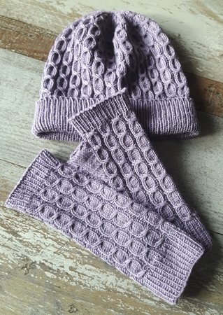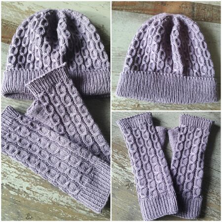 Die Armstulpen und die Mütze werden in Runden mit überkreuzten Maschen gestrickt und erfordern etwas Können und Fingerfertigkeit, da mit 2 Hilfsnadeln gearbeitet wird.