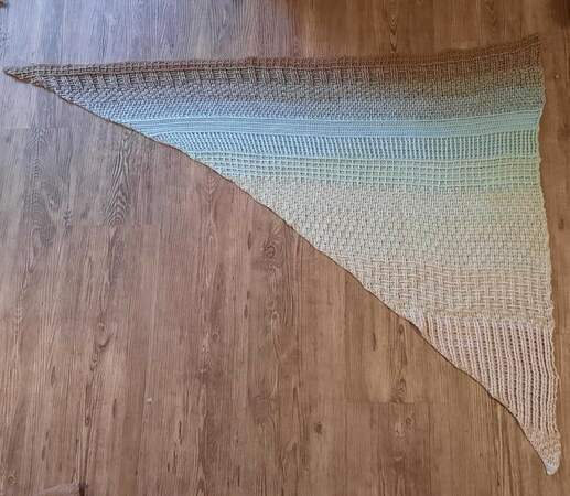 Das Beispieltuch ist mit einem Farbverlaufsbobbel von 1200 m LL und NS 3,5 gehäkelt worden