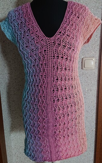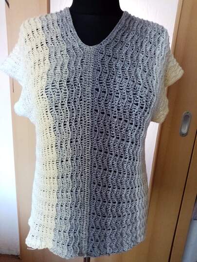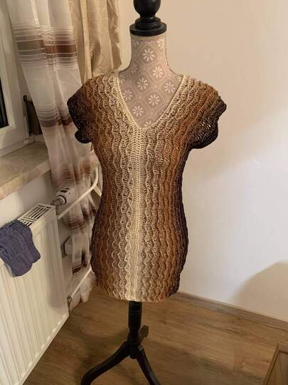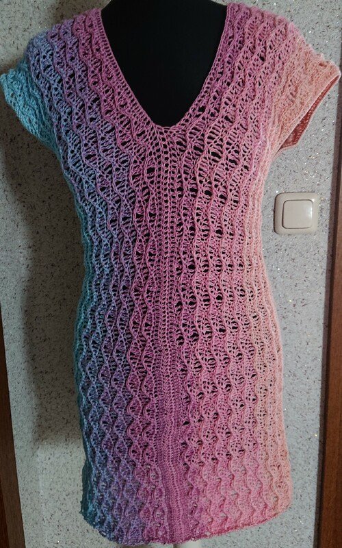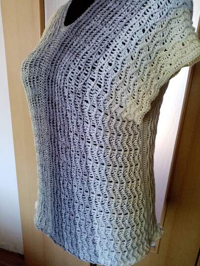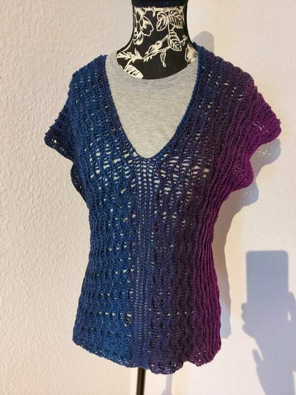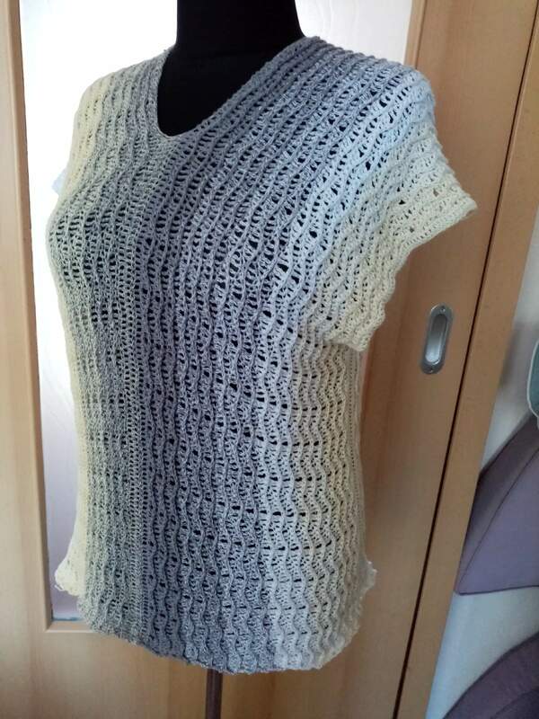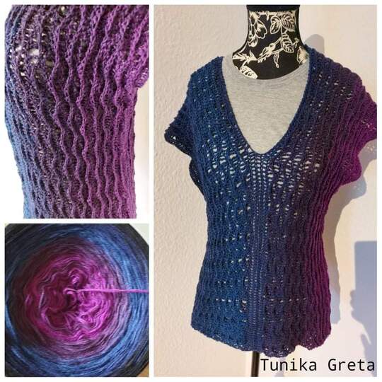 Die Tunika Greta wird in Reihen an einem Stück gehäkelt. Dadurch ist es hervorragend für Farbverlaufsgarn geeignet. Außerdem lässt es sich gut "nebenbei" häkeln, da das Muster schnell im Kopf bleibt.