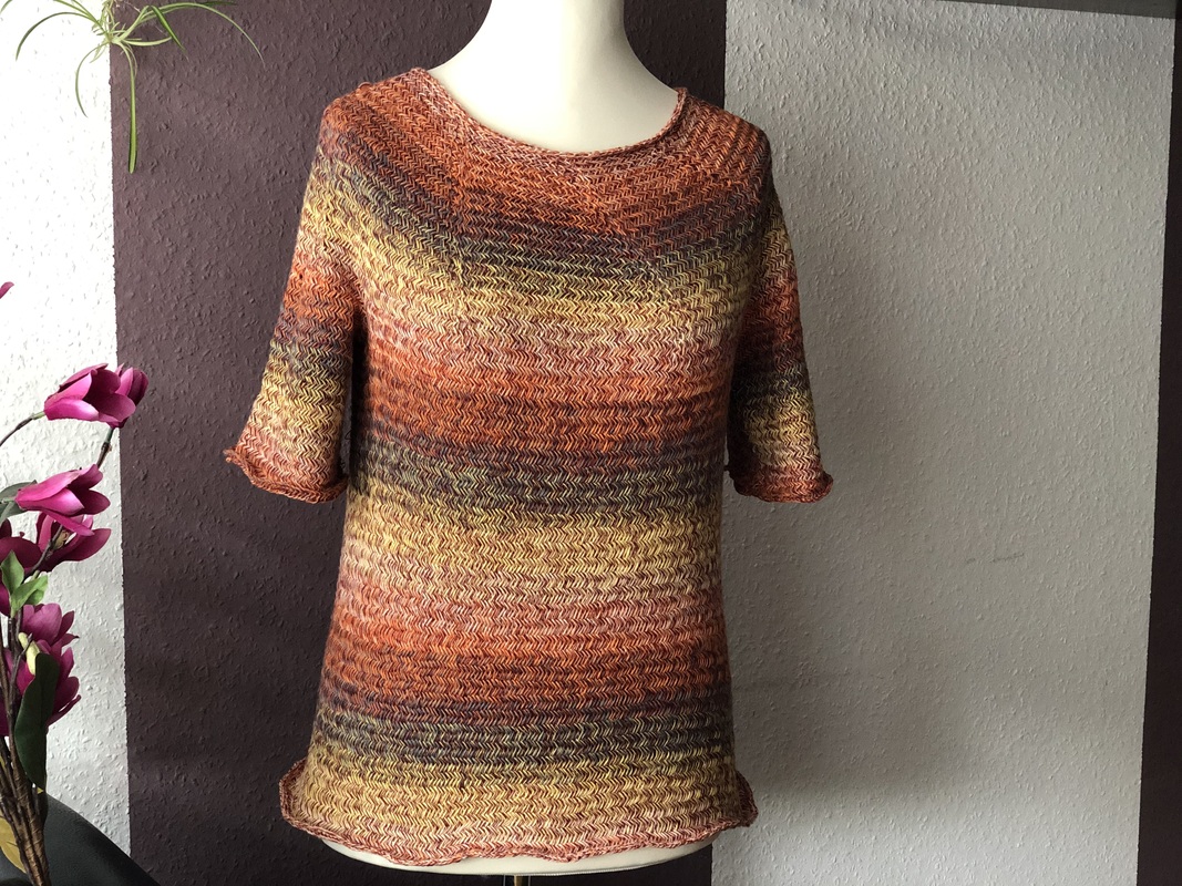 Dieser Rundhalspullover wird nahtlos in Runden gestrickt, was eine perfekte Passform ohne störende Nähte ermöglicht. Das Fischgrätmuster sorgt für eine spannende Herausforderung und verleiht dem Pullover eine robuste, aber dennoch elegante Struktur.