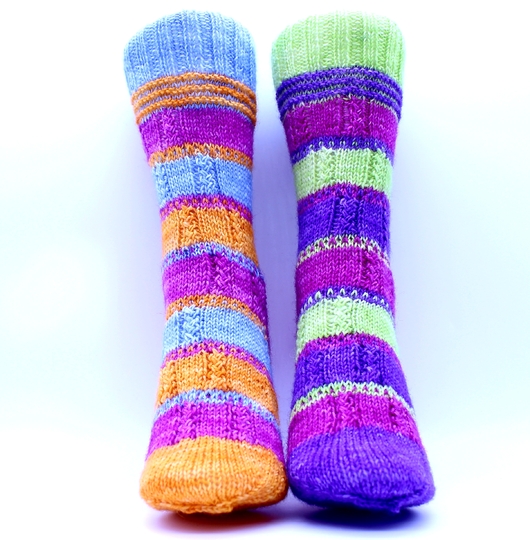 Diese Socken der Sockspiration No. 1 bis No. 10 sind so verschieden, dass das Stricken beider Socken eine neue Herausforderung ist und dennoch werden Farben und Musterelemente aufgegriffen, so dass trotz unterschiedlicher Socken ein Paar entsteht, Sockspiration eben, wer ist mutig genug für diesen neuen Sockentrend, der sich bereits mit den Oddsocks bei den Industriesocken durchsetzt und jetzt endlich Einzug in die Welt der Handarbeit hält?