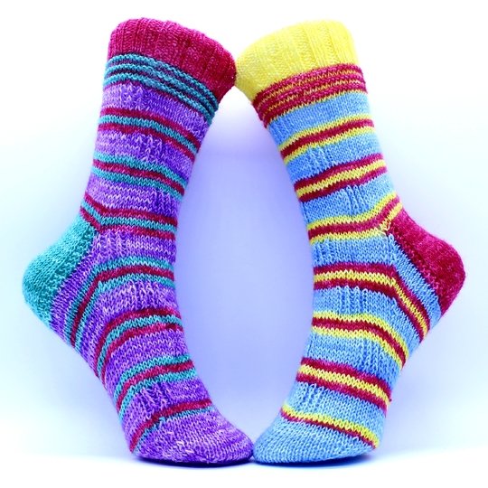 Diese Socken der Sockspiration 1 bis 10 sind so verschieden, dass das Stricken beider Socken eine neue Herausforderung ist und dennoch werden Farben und Musterelemente aufgegriffen, so dass trotz unterschiedlicher Socken ein Paar entsteht, Sockspiration eben, wer ist mutig genug für diesen neuen Sockentrend, der sich bereits mit den Oddsocks bei den Industriesocken durchsetzt und jetzt endlich Einzug in die Welt der Handarbeit hält?