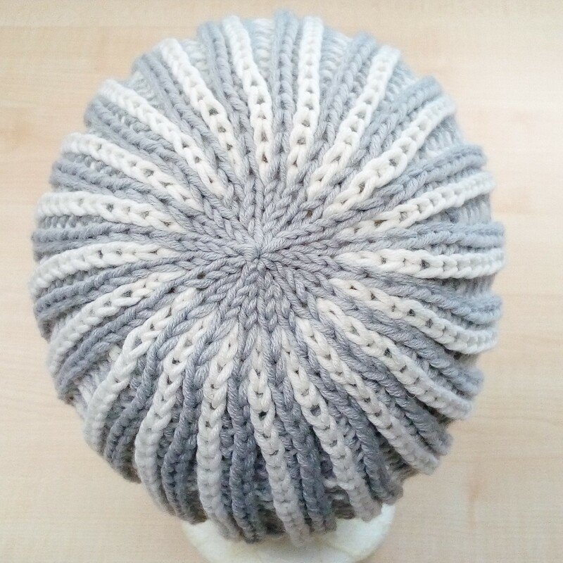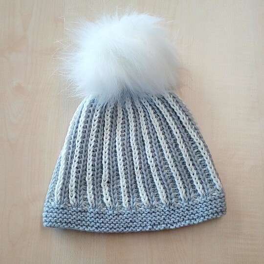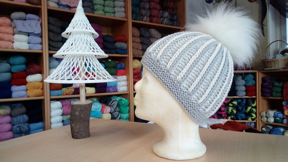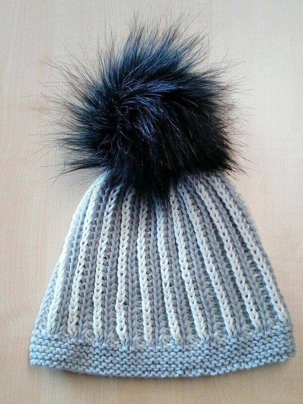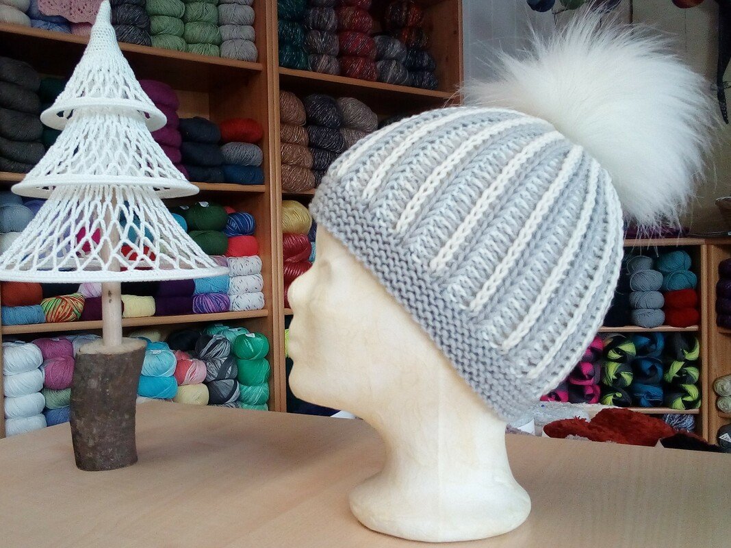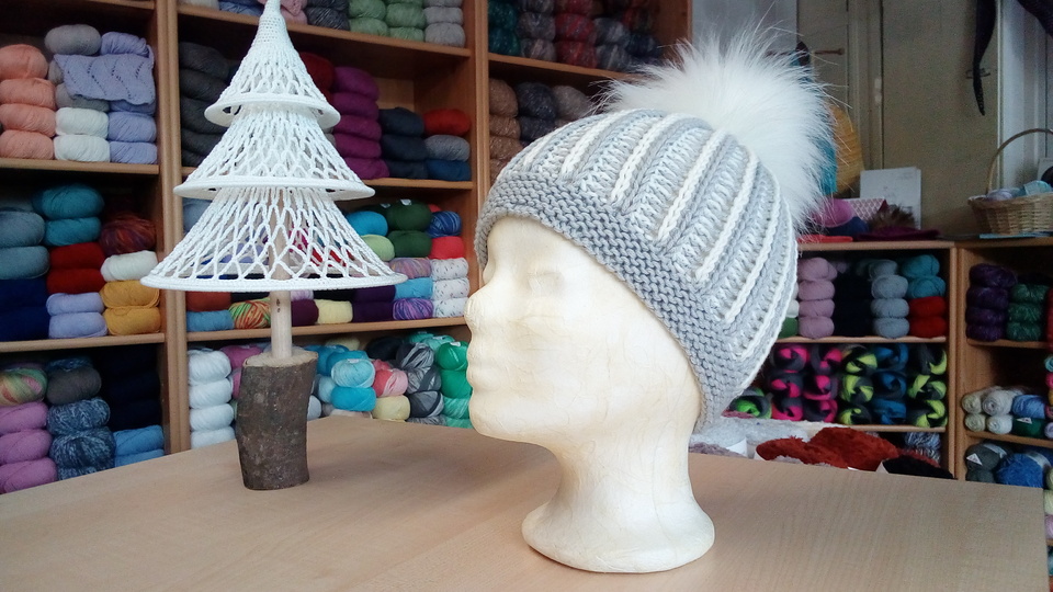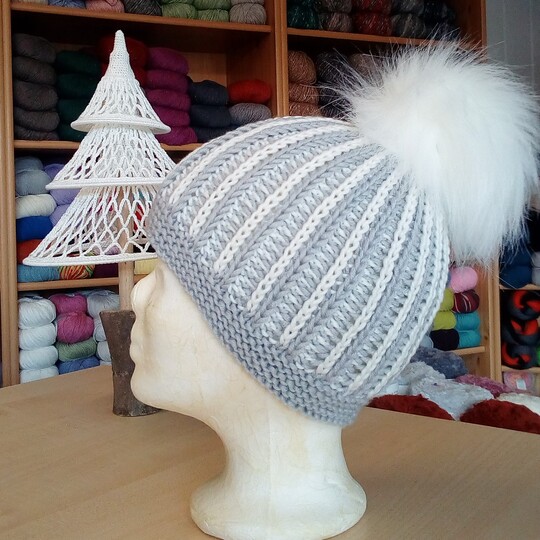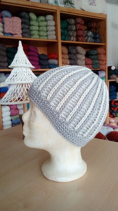 Diese schöne Mütze im zweifarbigen Rippenpatent kannst Du ganz schnell stricken. Das Muster ist auffällig,