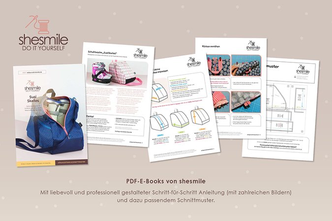 PDF-E-Books von shesmile: Diese leicht verständliche Schritt-für-Schritt-Anleitung mit vielen Fotos ist auch für Nähanfänger geeignet, denn die sehr ausführliche Fotoanleitung begleitet dich bei jedem Schritt.
