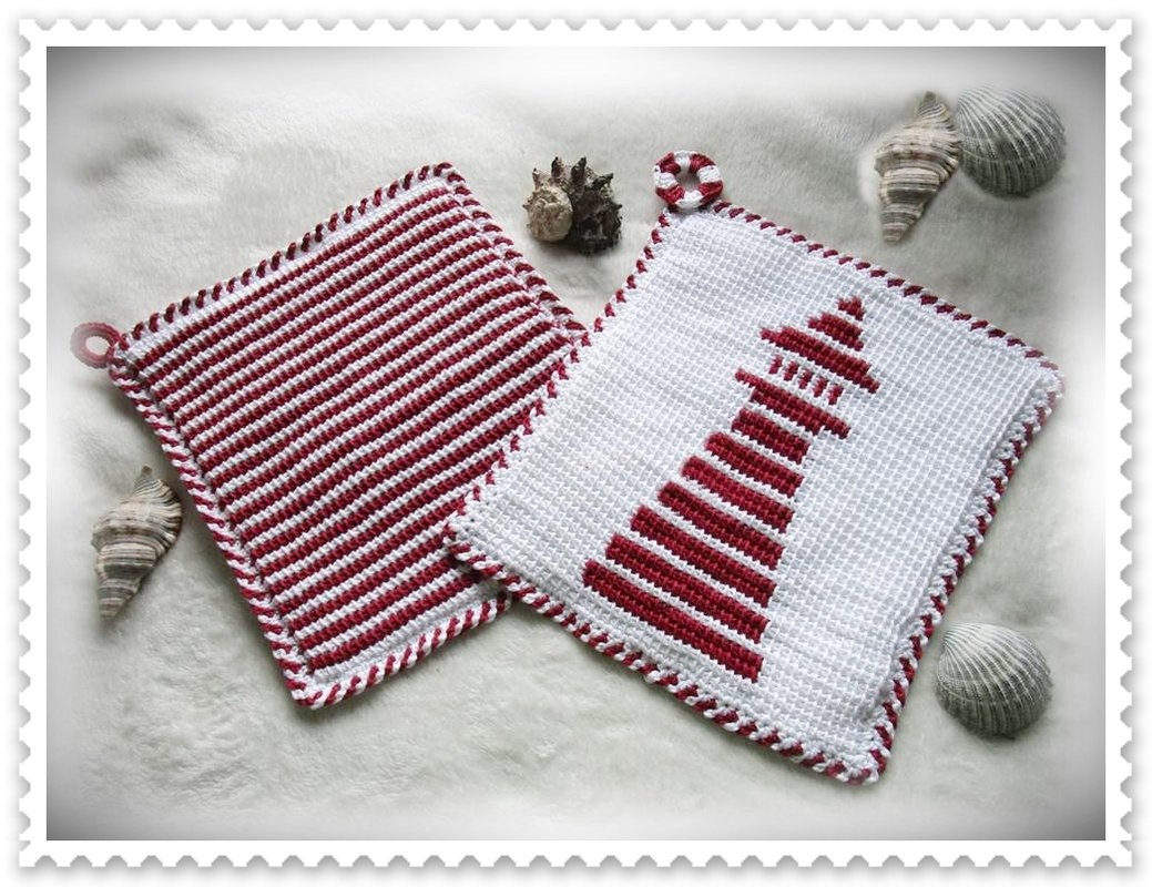 Mit diesen Leuchtturm Topflappen im Streifendesign bringst du den maritimen Stil in deine Küche.