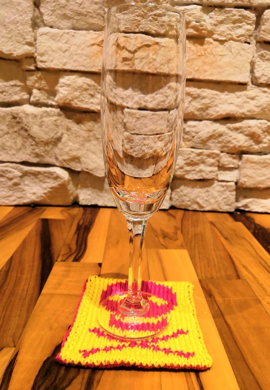 Der fertige Untersetzer misst ca. 10 x 10 cm (bei vergleichbarer Maschenprobe).