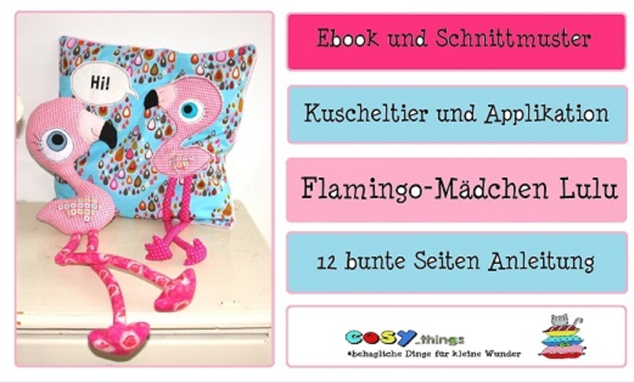 Beim Kauf dieses tollen Ebooks, erwarten dich eine im Comic-Style gestaltete Schritt für Schritt-Nähanleitung sowie eine Schnitt-Vorlage, um sich selbst ein Kuscheltier oder eine Applikation mit dem Flamingo-Mädchen Lulu zu nähen.