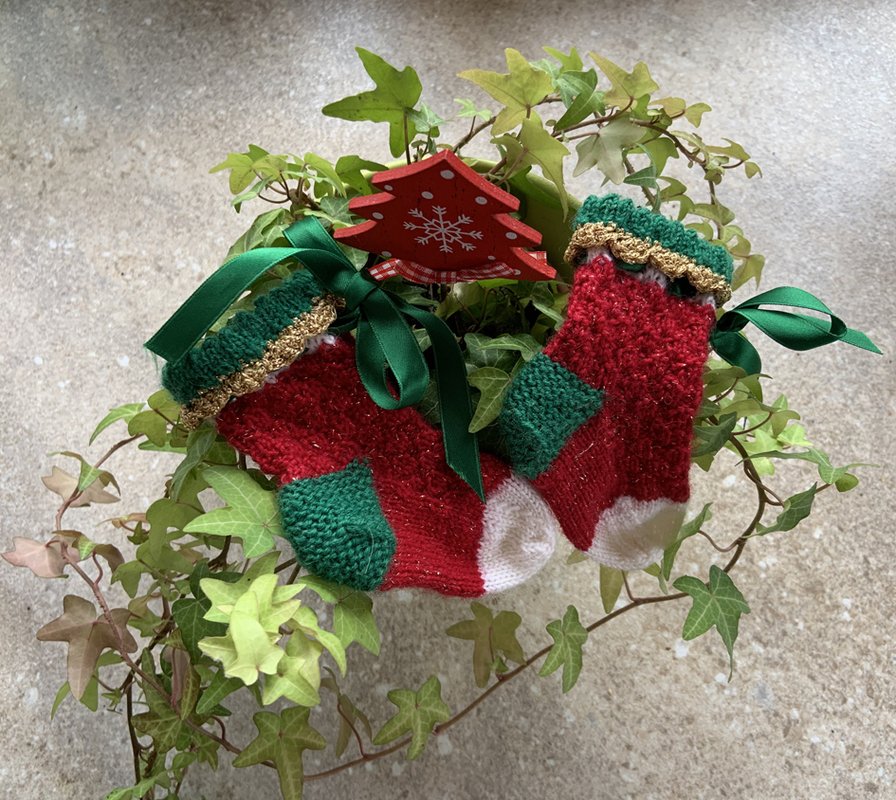 Diese Weihnachtssöckchen mit Glitzerfaden sind für ganz kleine Babys von 0 bis 3 Monaten gedacht. Die Söckchen haben ein einfaches Muster, eine Käppchenferse und eine kleine Glitzerborte am Mausezähnchenrand.