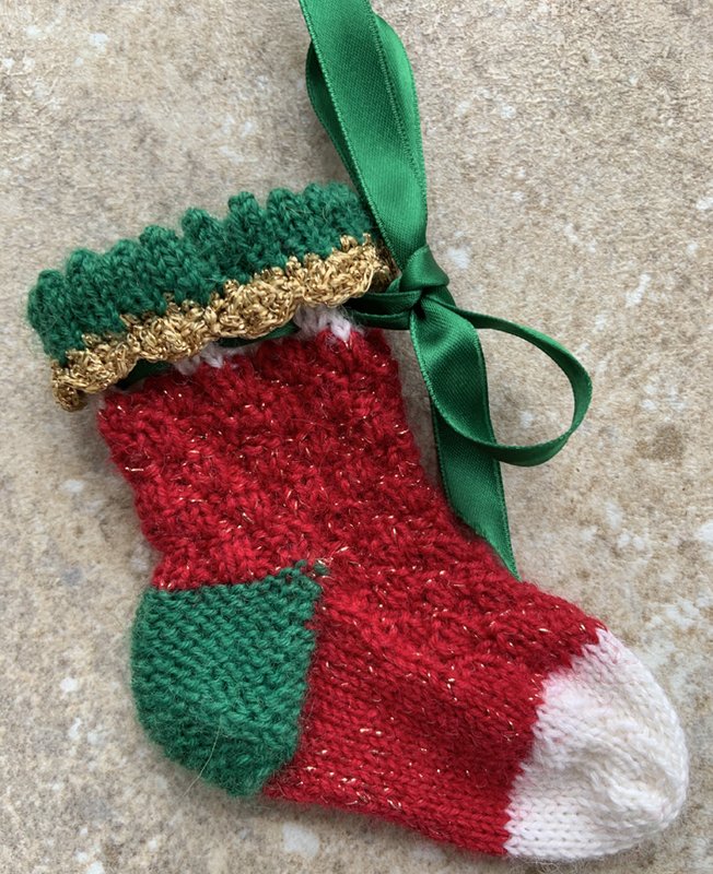 Wollreste von Sockenwolle in den Farben Rot, Grün, Weiß und Hellgrün. 1 Garn in Gold und ein Beilaufgarn ebenfalls in Gold, Hersteller des Beilaufgarns Madeira Metallic. Ich habe Sockenwollreste von Wolle Rödel und Lana Grossa benutzt. 1 Nadelspiel Stärke 2,5, 1 Häkelnadel Stärke 3, 1 Stopfnadel mit großem Öhr. Als Bändchen entweder ein Satinbändchen oder ein Samtbändchen.