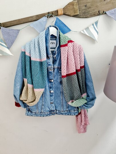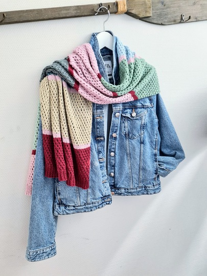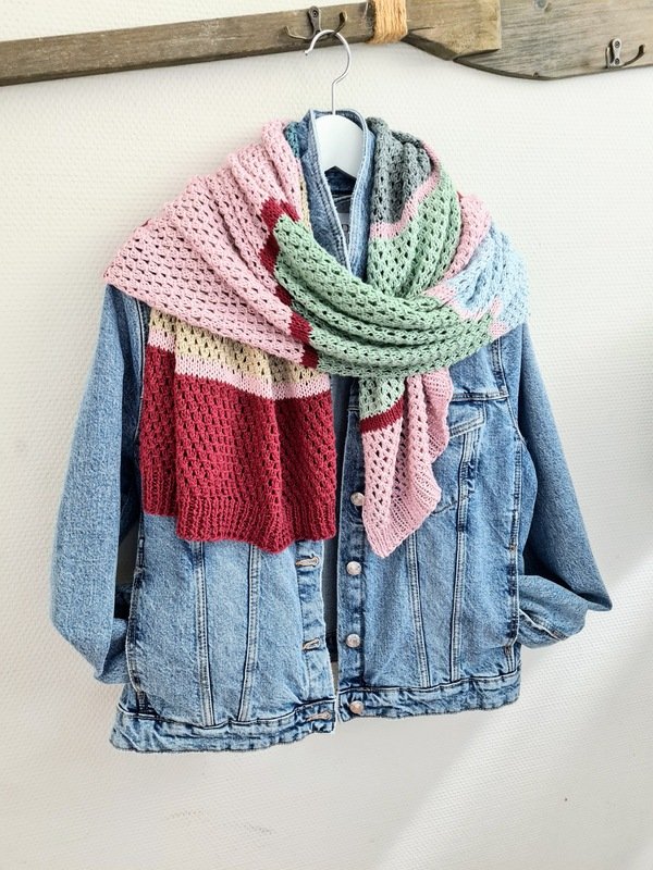 Die Stola wird aus acht verschiedenen Farben gestrickt. Ich kann sie mir auch gut mit weniger Farben vorstellen, die sich dann immer wiederholen.