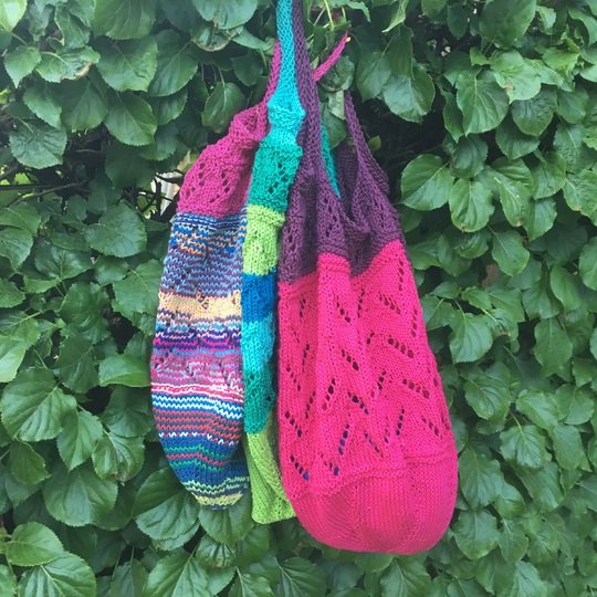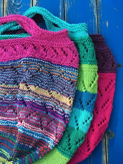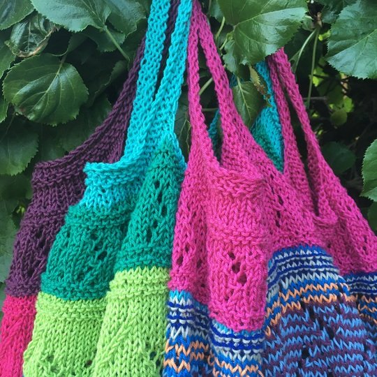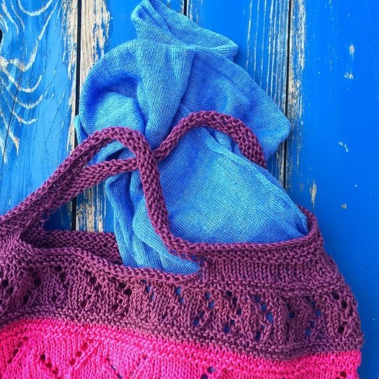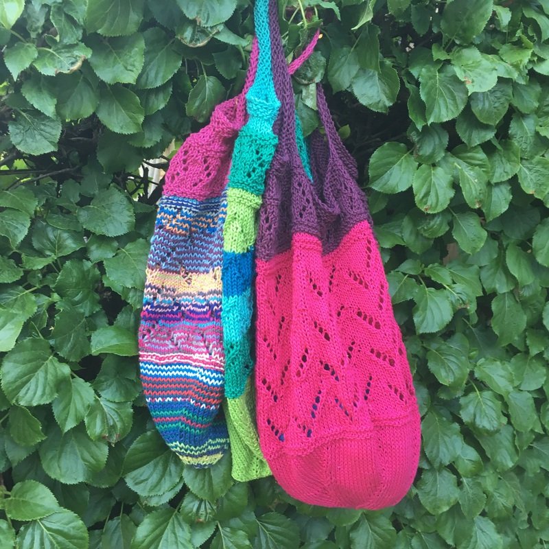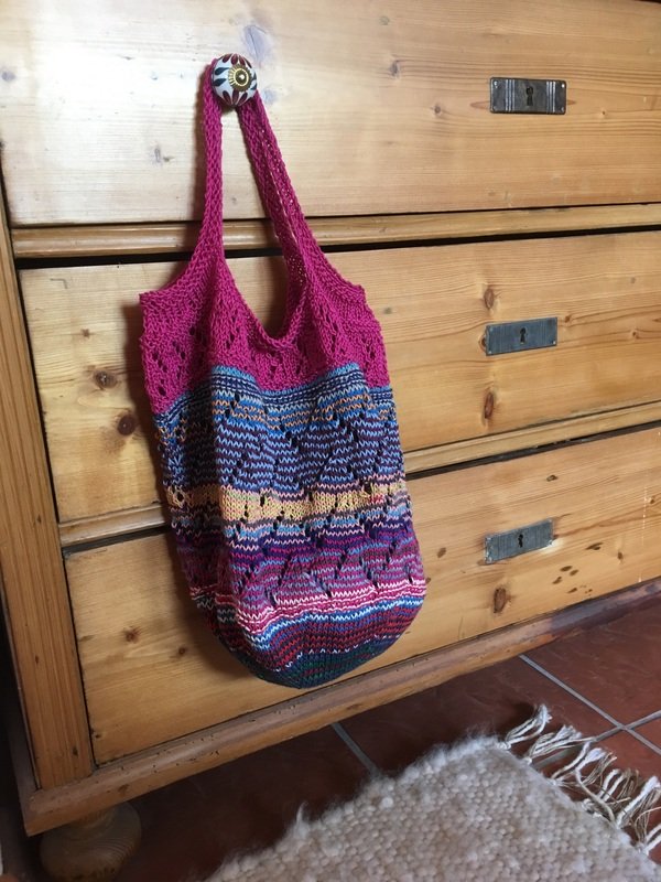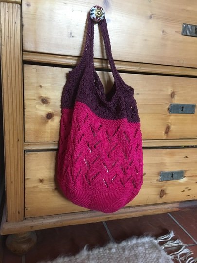 Auf Zack! Ist ein leichter Beutel, den man zusätzlich in eine Tasche packen kann oder für den kleineren Einkauf beim Bäcker mitnehmen kann. Die beiden Zackenmuster sind einfach aber doch abwechslungsreich zu stricken.