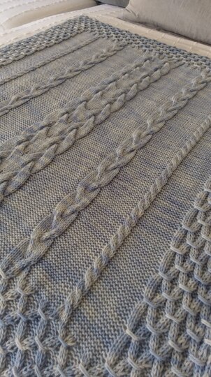 Eine wunderbar kuschelige Decke für den Kinderwagen oder zum einkuscheln an kalten Tagen. Am Stück gestrickt mit tollen Zopfmustern und einer herrlichen Randbordüre, die aussieht wie ein Zopfmuster, aber gar keins ist. Der Smocking Stitch ist nicht schwer und geht sehr einfach von der Hand.