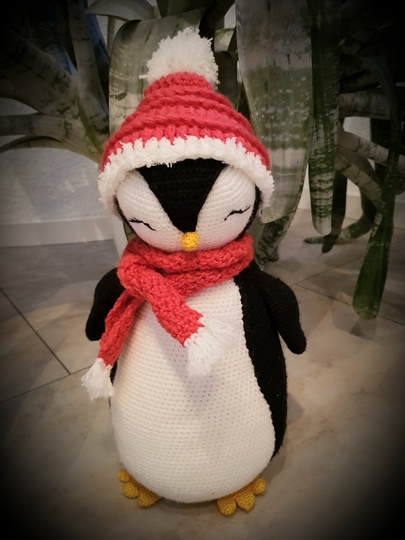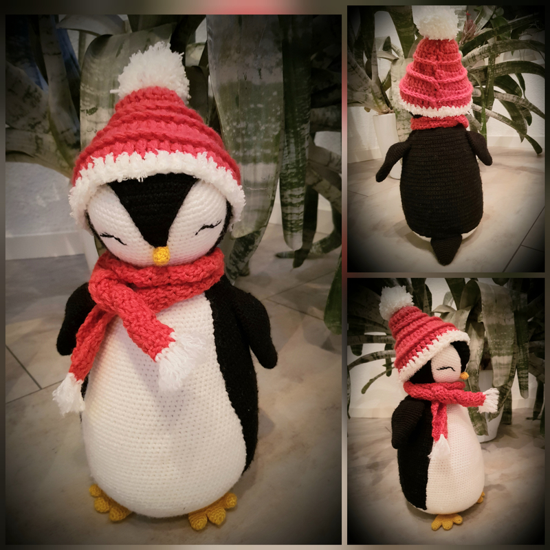 Es handelt sich um einen großen XL Pinguin der stehend 30 cm hoch ist. Oben drauf kommt die Weihnachtsmütze die ca. 20 cm groß ist und leicht schräg aufsitzt. Somit kommt der Pinguin mind. auf eine Größe von 40 cm. In der Anleitung sind alle Details, Schritt für Schritt dokumentiert.