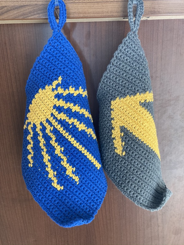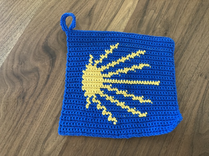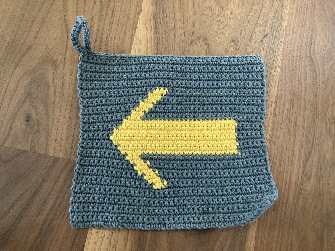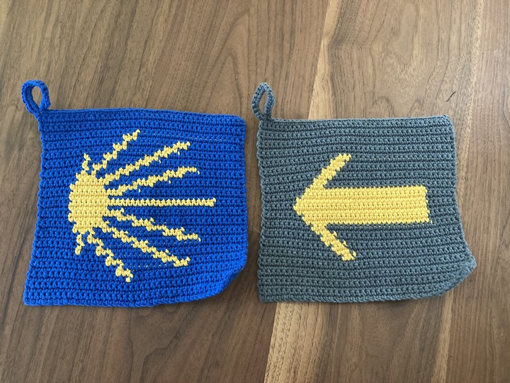 für 2 Topflappen „gelber Pfeil“ oder für 2 Topflappen „Muschelwegweiser“:
