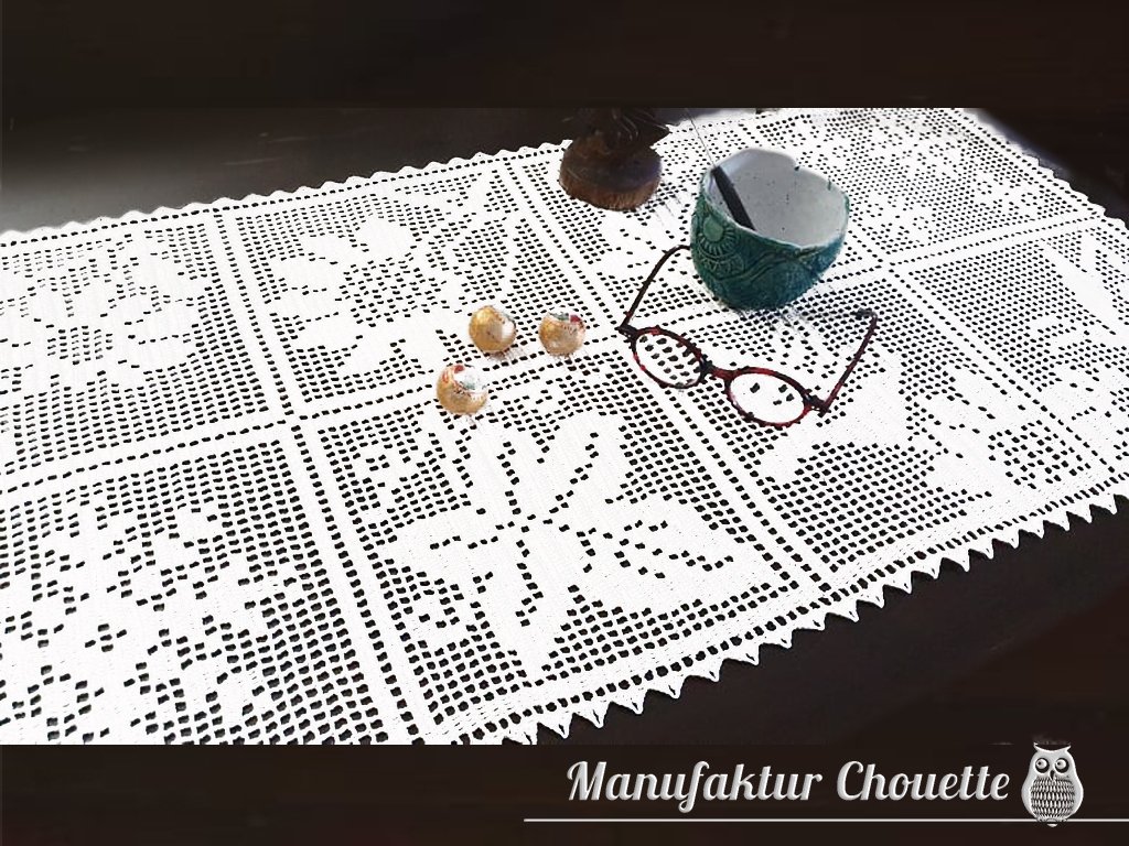 Du kannst gern so viele Tischläufer häkeln, wie Du möchtest. Mit einem Hinweis auf mein Urheberrecht der Anleitung darfst Du Deine selbst hergestellten Tischläufer auch zum lokalen Kauf anbieten. Angebote als Auktion sind NICHT gestattet!"