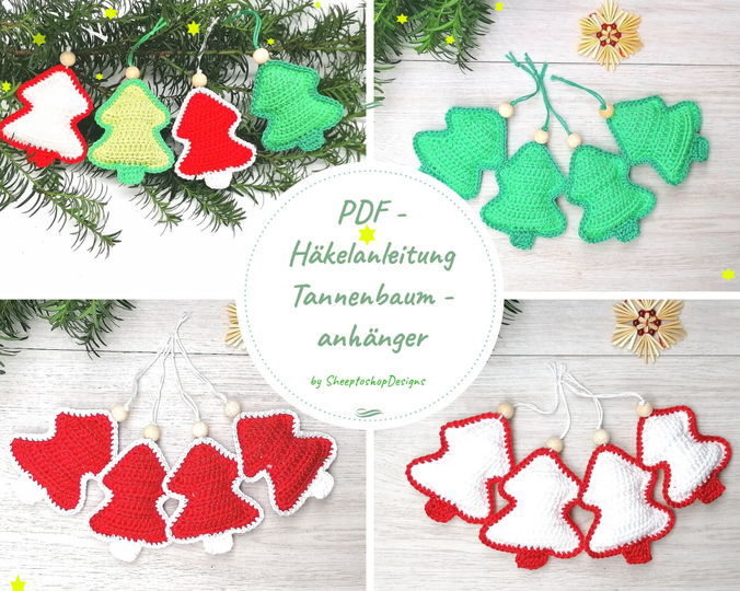 zu Weihnachten. Die Anhänger werden doppelseitig gehäkelt und mit Füllwatte gefüllt. Der Tannenbaumanhänger hat ein Band zum Aufhängen. Eine kleine Holzperle ziert den Christbaumschmuck.