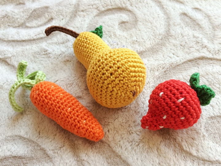 Diese Häkelanleitung ist geeignet für Leute die Erfahrung im Häkeln haben und wissen wie man einen Fadenring macht und wie man feste Maschen Stäbchen und halbe Stäbchen häkelt. Diese Häkelanleitung beinhaltet eine Erdbeere, eine Birne und eine Karotte.Die Anleitung ist in deutsch auf 9 Seiten verfasst, leicht verständlich und mit vielen Bildern zum bessern Verständnis versehen. Es ist eine PDF-Datei