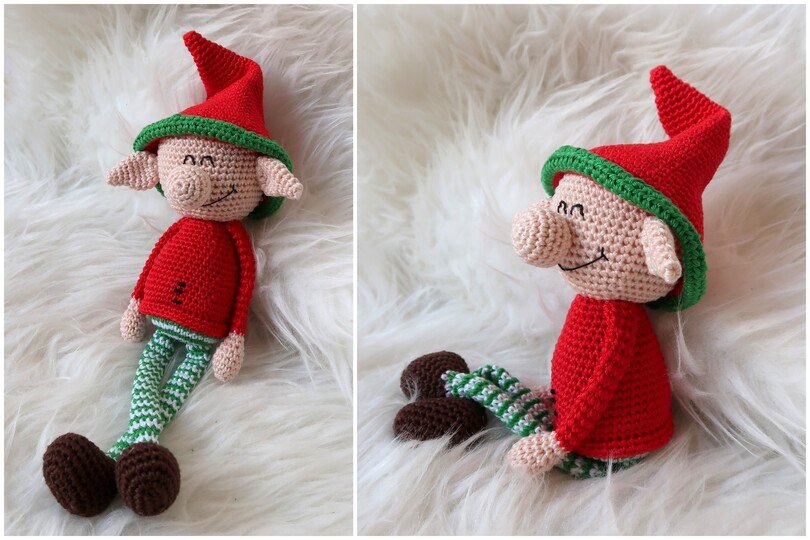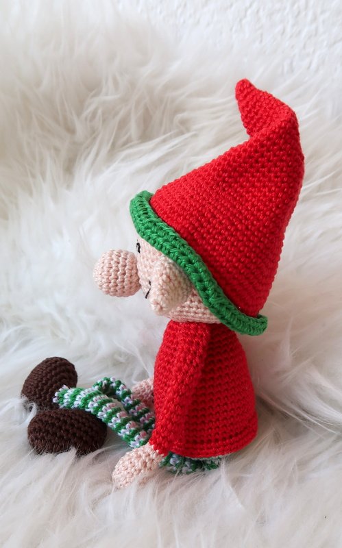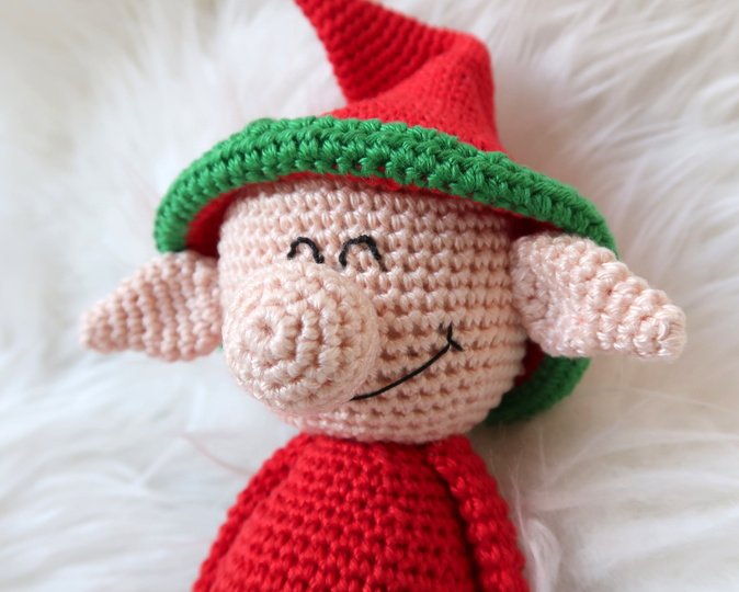 Wenn du mit Baumwolle (125m LL auf 50g) häkelst, wird dein Elf von Mützen- bis Zehenspitze ca. 34cm lang - ohne Mütze sind es ca. 24cm.