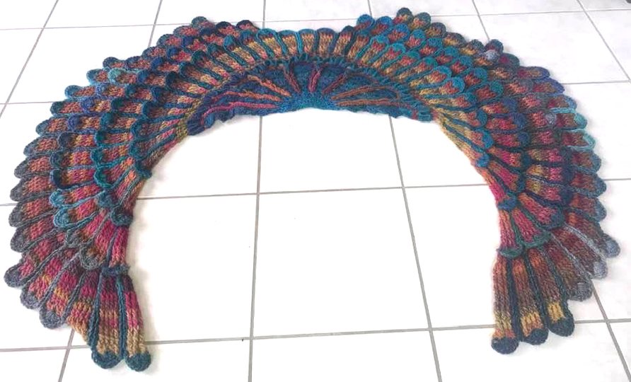 Mein Tuch IKARUS wiegt fertig 490 gr , ist 212 cm breit und an der breitesten Stelle 60 cm.