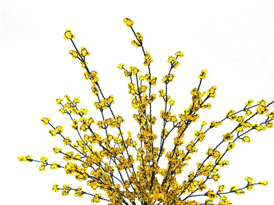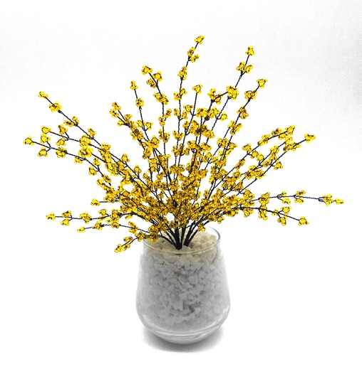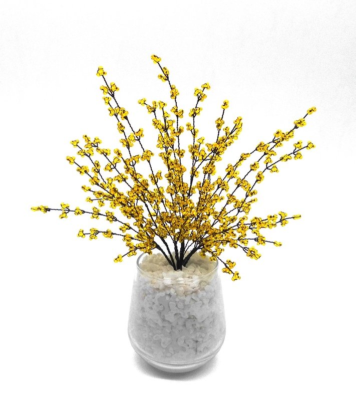 Der Forsythien-Bonsai aus funkelnden Perlen und Draht bringt Dir dieses Gefühl das ganze Jahr über nach Hause.