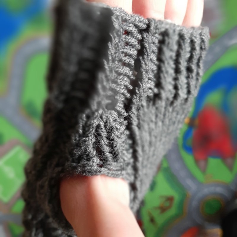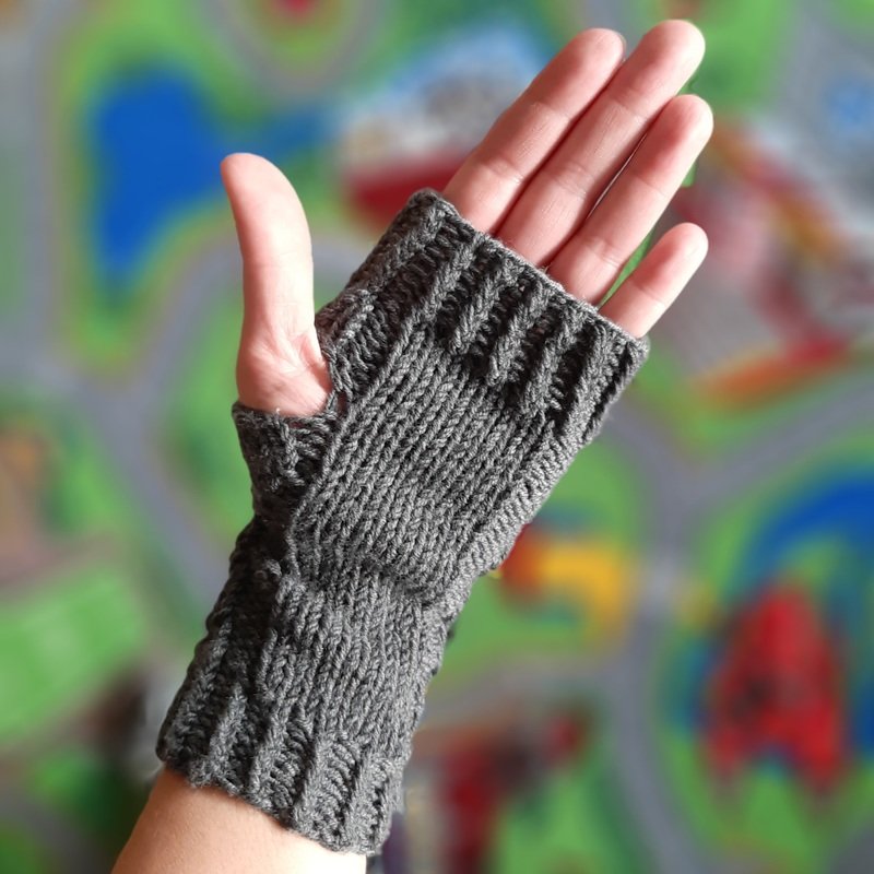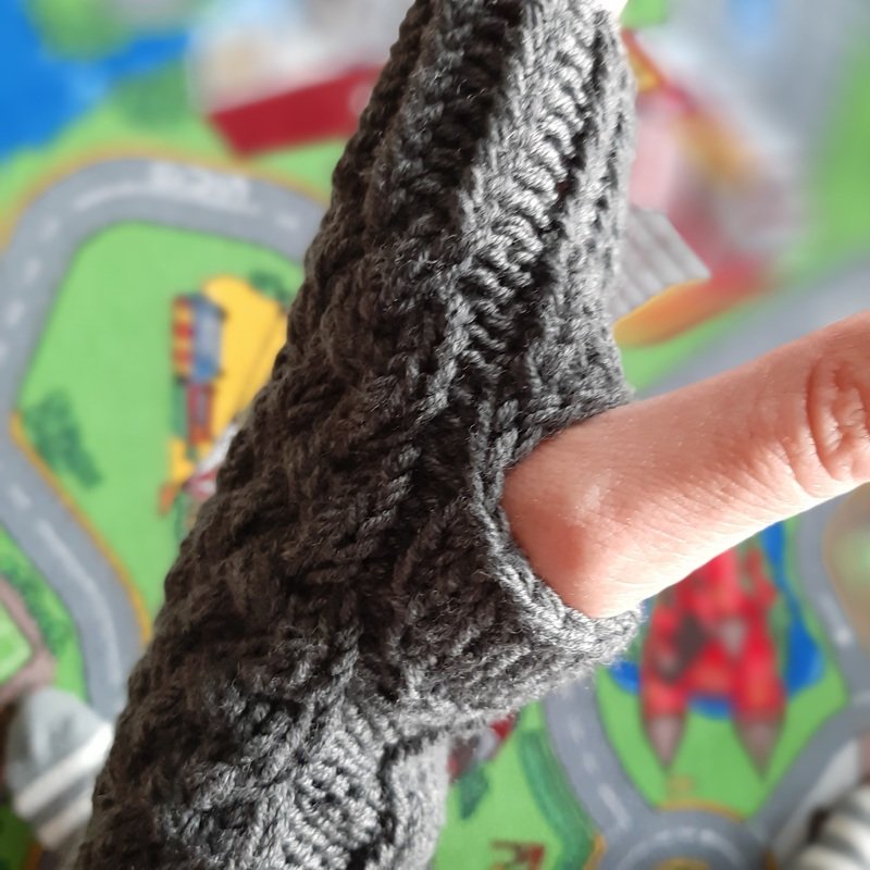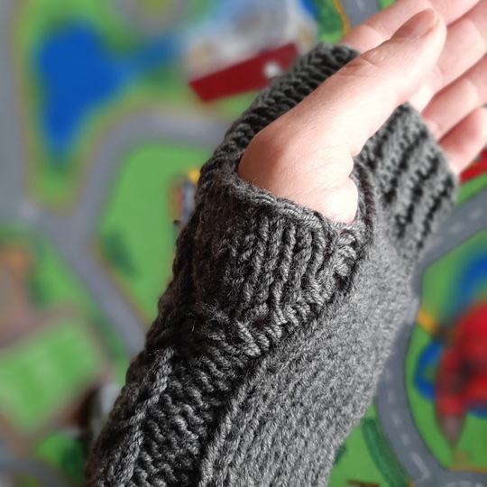 Für andere Größen entweder +/- 2 Maschen (M) nehmen oder etwas dickeres Garn mit dickeren Nadeln nehmen und den glatt rechts gestrickten Part auf der Handinnenseite entsprechend erweitern/verkleinern.