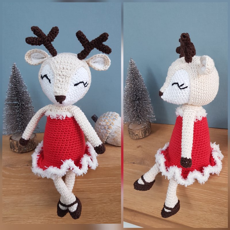 Es handelt sich um ein süßes Weihnachts-Reh in einem roten Kleidchen und braunen Ballarinas das insgesamt 25 cm groß ist. In der Anleitung sind alle Details, Schritt für Schritt dokumentiert.