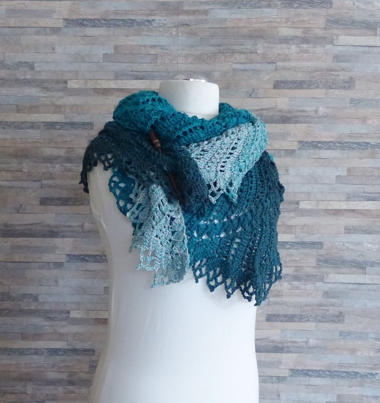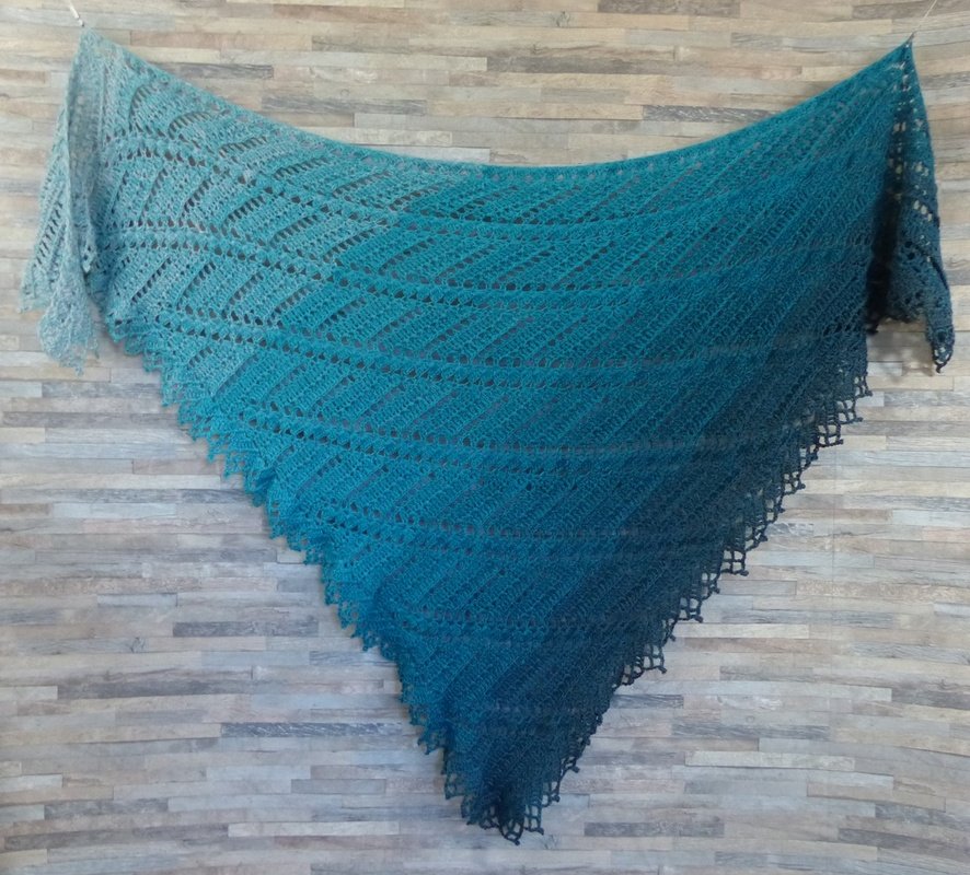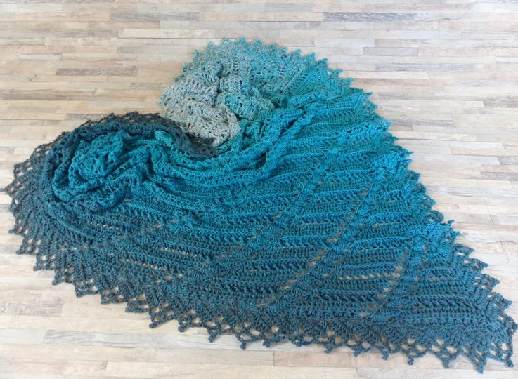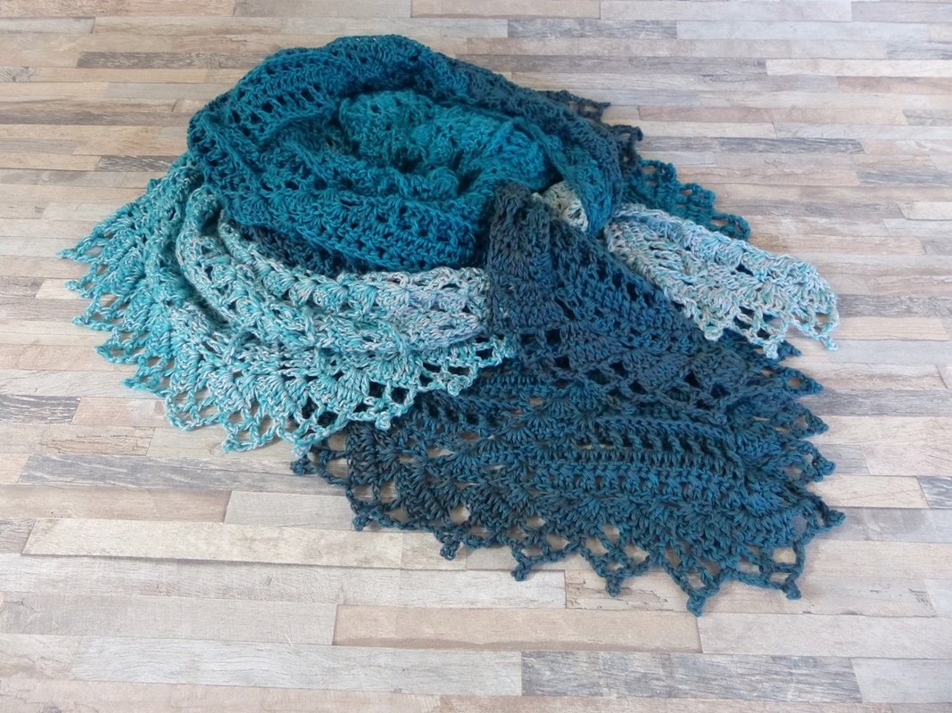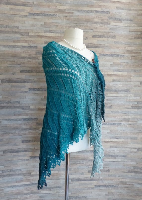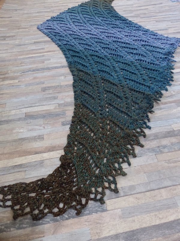 "Taran" ist ein gehäkelter Drachenschwanz mit schönem Strukturmuster (Relief + Muschelmuster) und seitlichen Zackabschluss. Alles was ein Drachenschwanz braucht. Die Zacken geben dem Tuch einen sehr verspielten Charakter.
