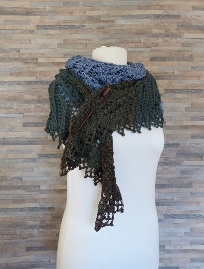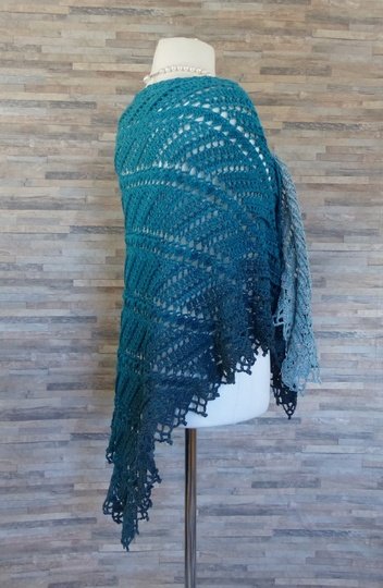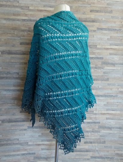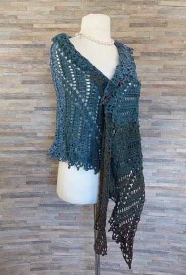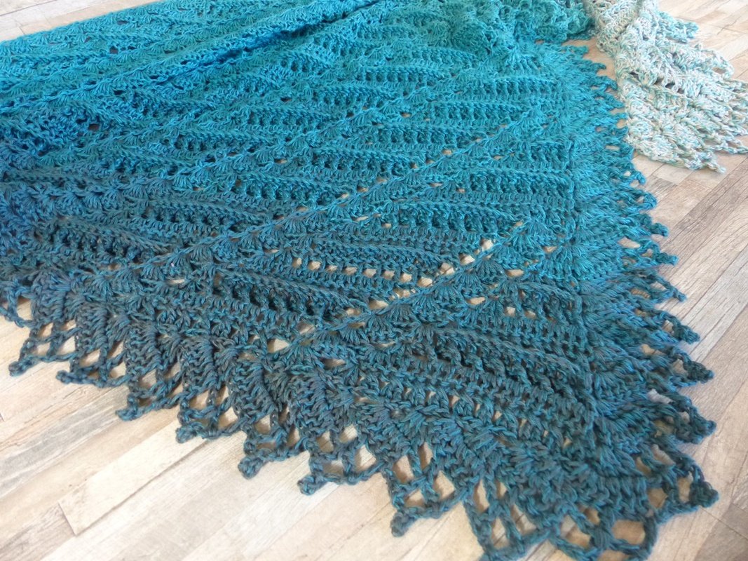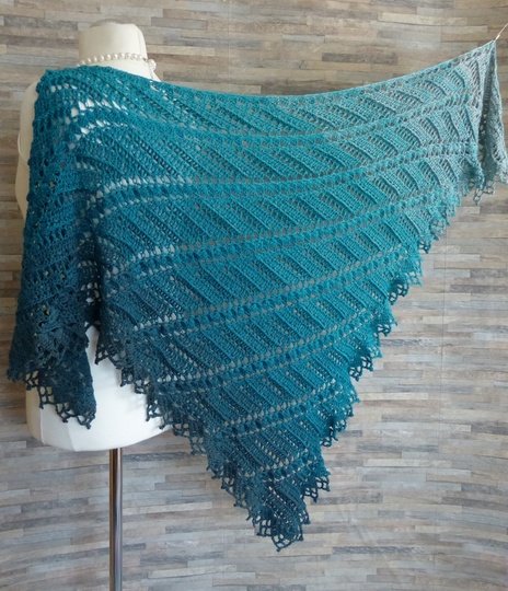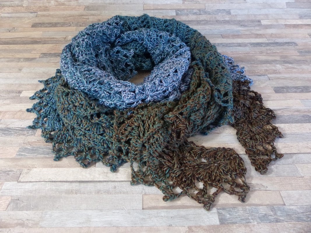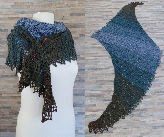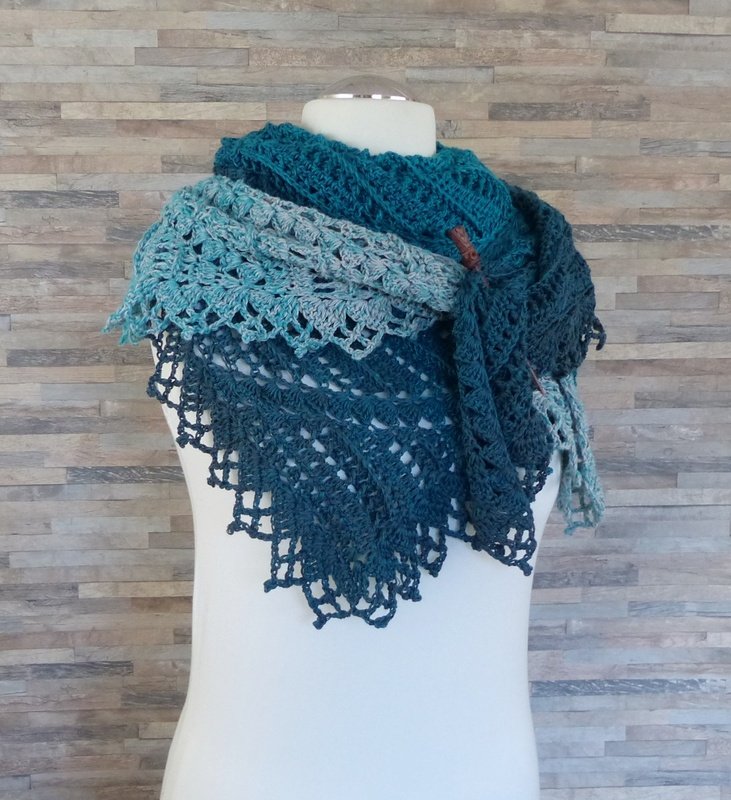 "Taran" ist ein gehäkelter Drachenschwanz mit schönem Strukturmuster (Relief + Muschelmuster) und seitlichen Zackabschluss. Alles was ein Drachenschwanz braucht. Die Zacken geben dem Tuch einen sehr verspielten Charakter.
