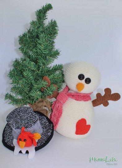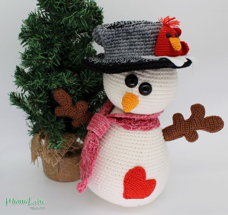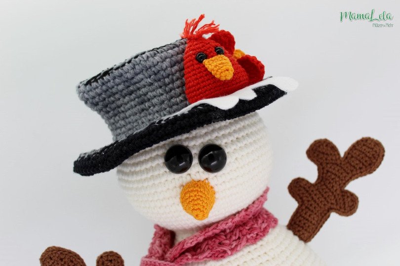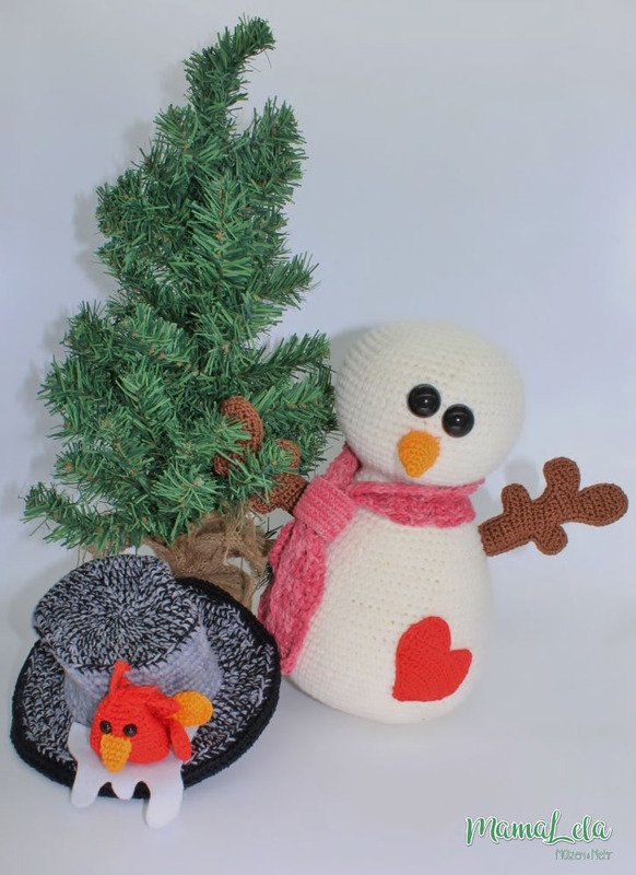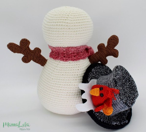 Mit dieser Häkelanleitung könnt ihr euch den im Artikelbild gezeigten Schneemann mit seinem gefiederten Freund zaubern.