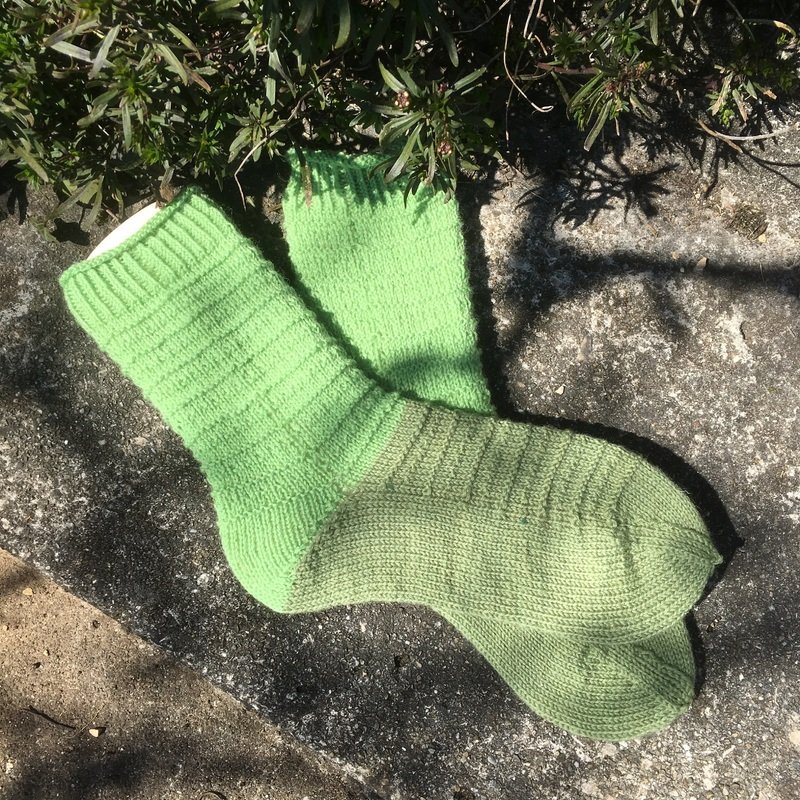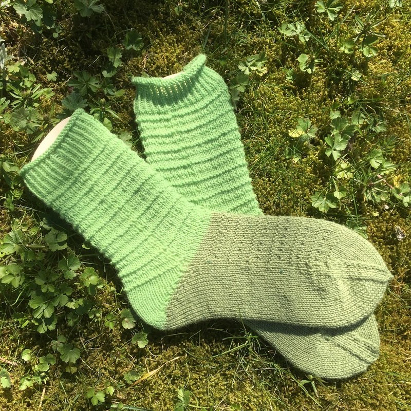 Beispiel: 2 verschiedene Grüntöne der „Söckli“ von Woll Butt, 4 fädig und 2,5 mm Addi Crasy Trio Nadeln / 2,5 mm Nadelspiel