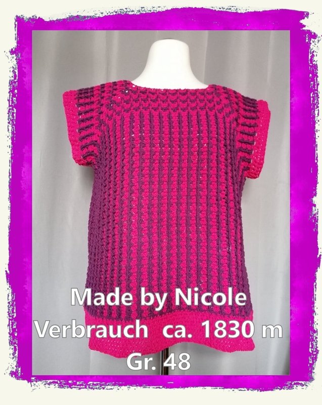 Für Gr. 38 habe ich gebraucht: Korpus = 2x 4fädiger Bobbel je ca. 700m & Ärmel = 2x 360m
