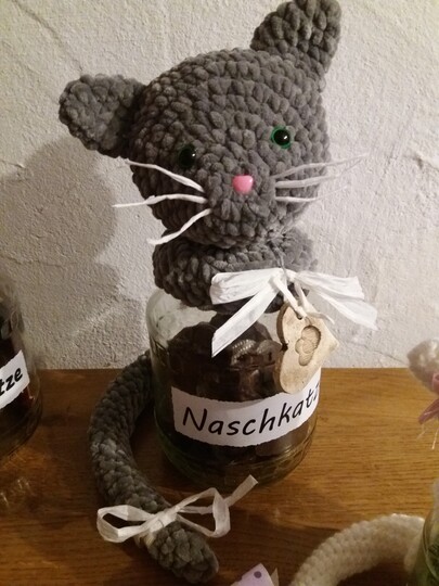 In meiner Anleitung wird durch Bilder und Text genau beschreiben wie du die Naschkatzen nachhäkeln und auf die Gläser kleben kannst.