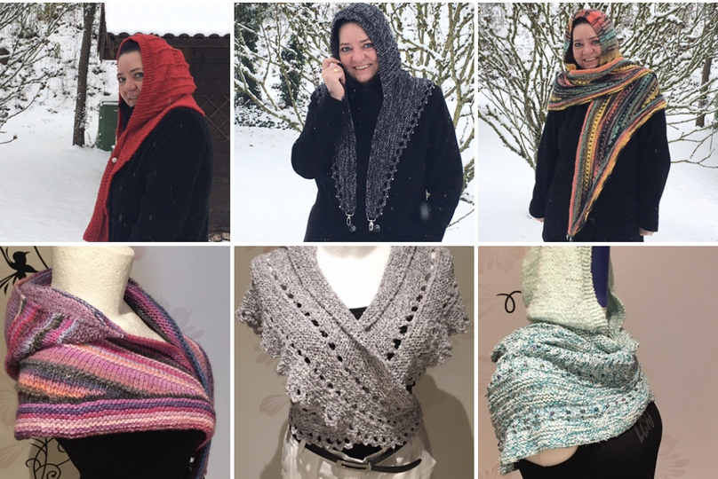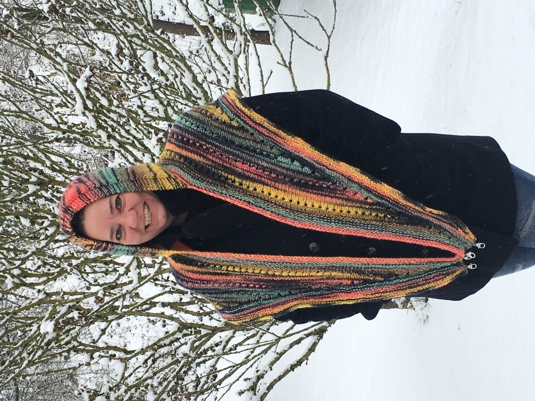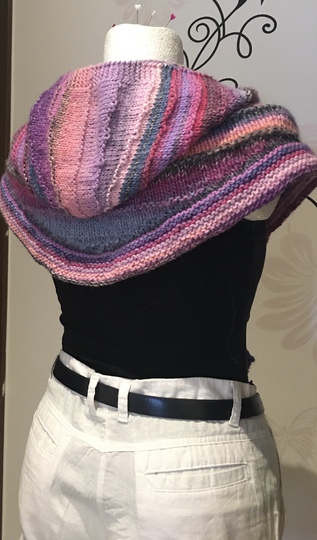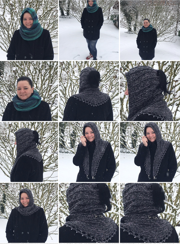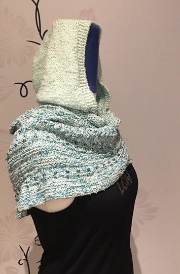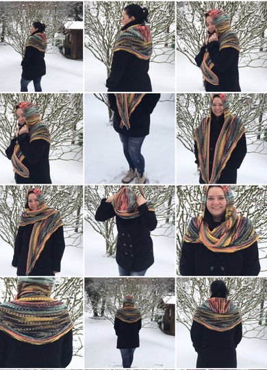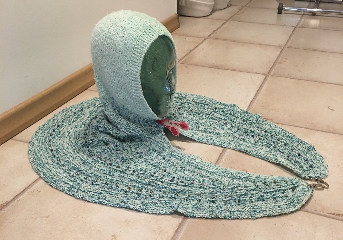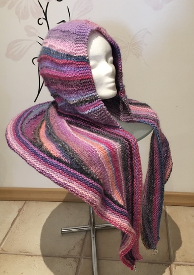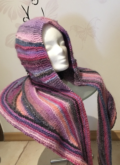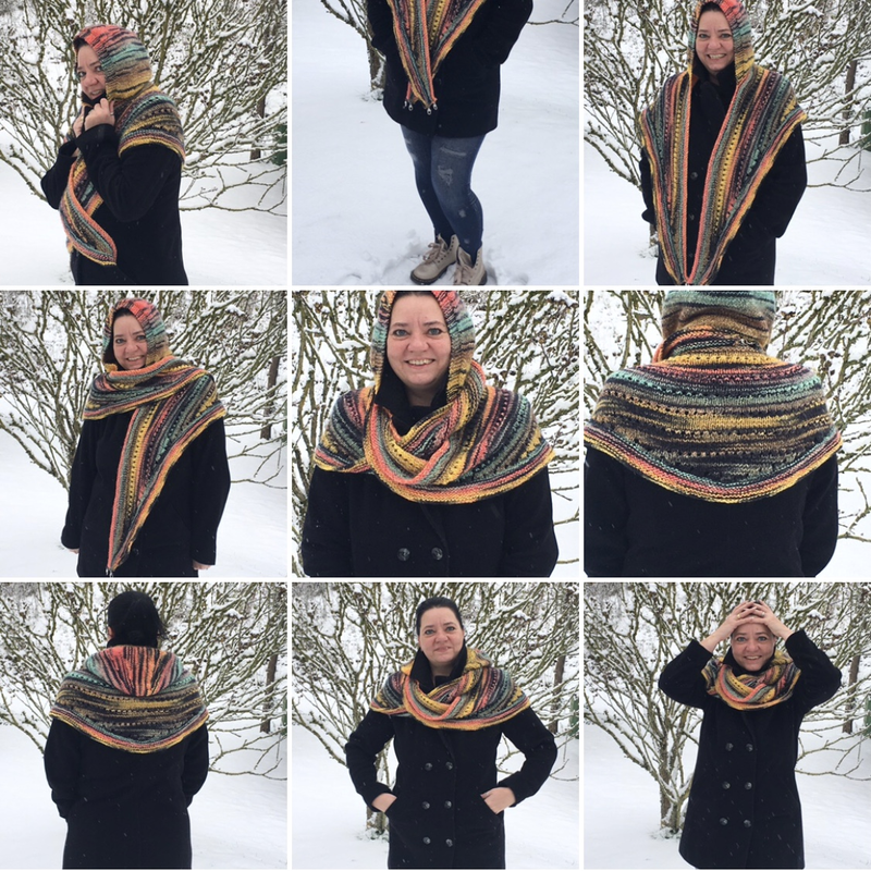 Die Formgebung der Kapuze wird durch „verkürzte“ Reihen erzielt. Das Tuch wird ebenfalls mit „verkürzten“ Reihen gestrickt.
