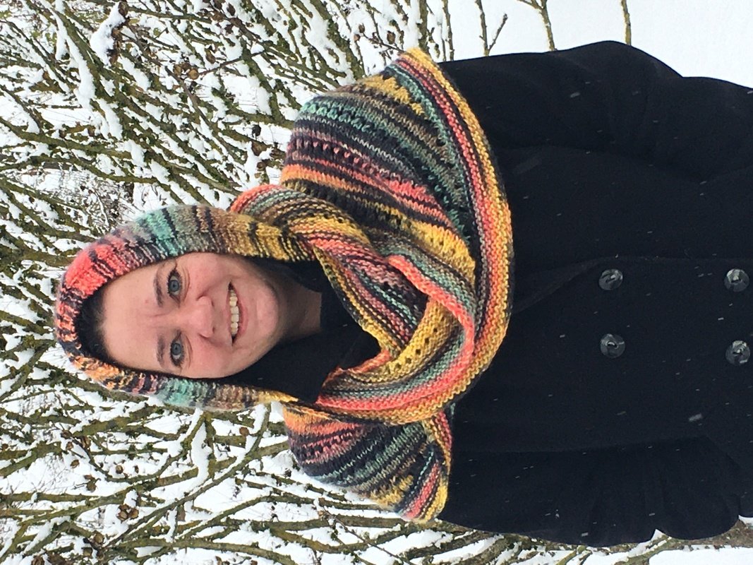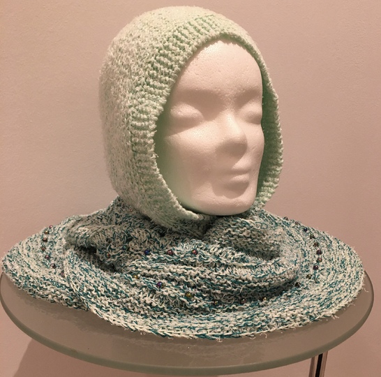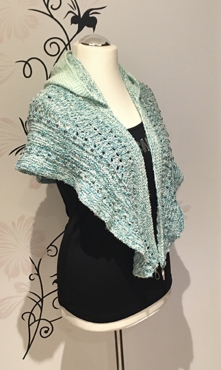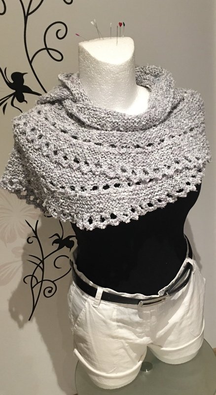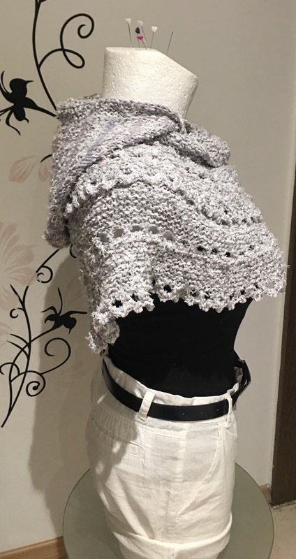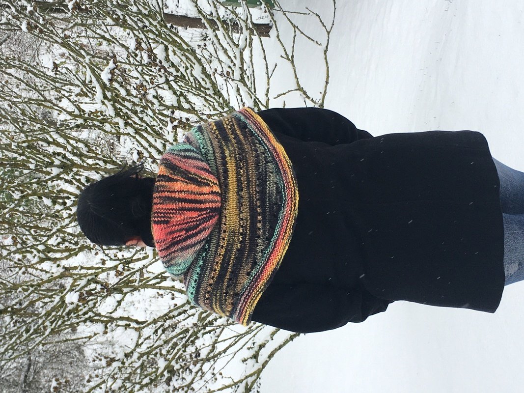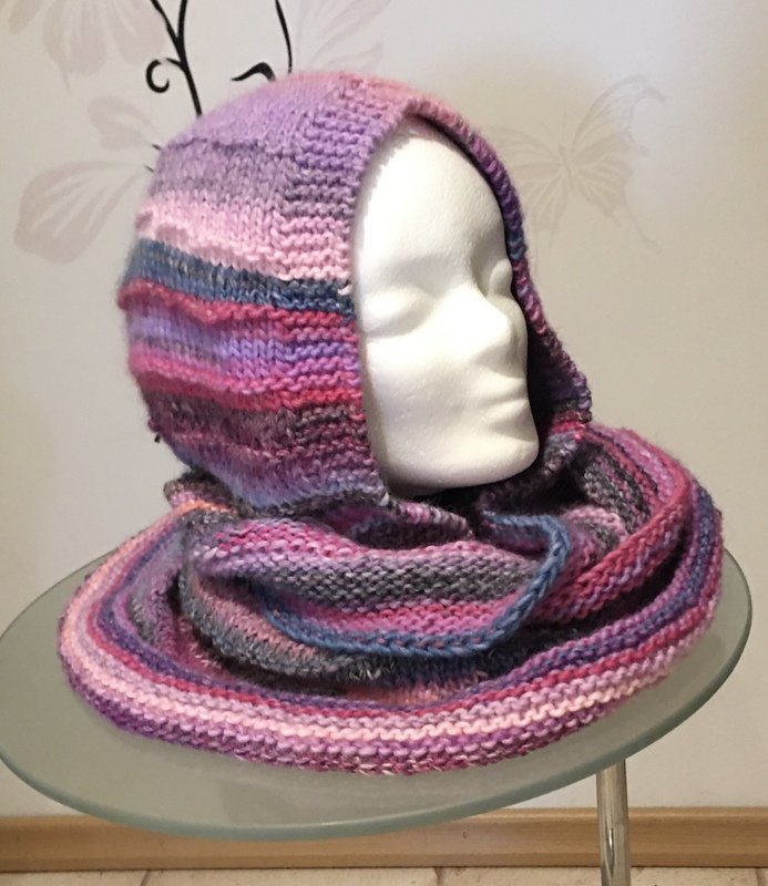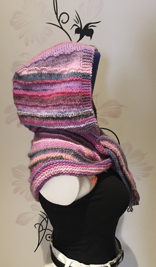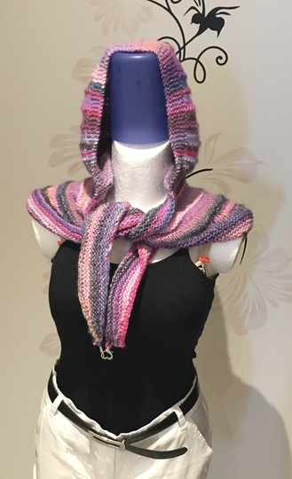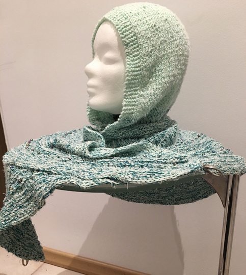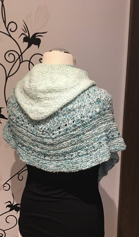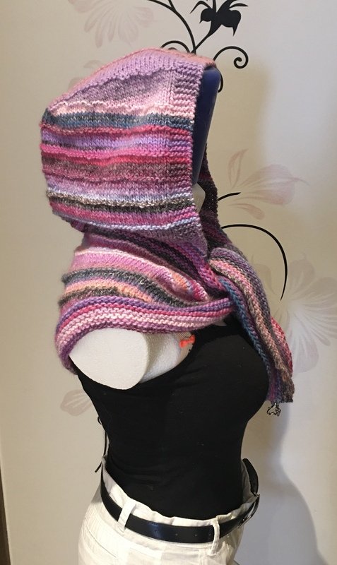 Die Formgebung der Kapuze wird durch „verkürzte“ Reihen erzielt. Das Tuch wird ebenfalls mit „verkürzten“ Reihen gestrickt.