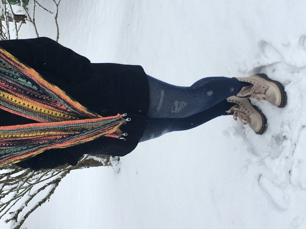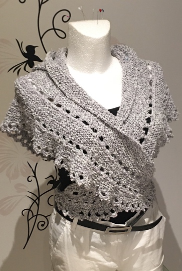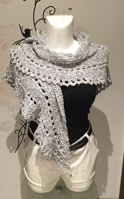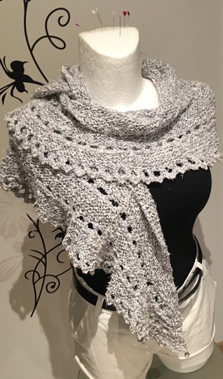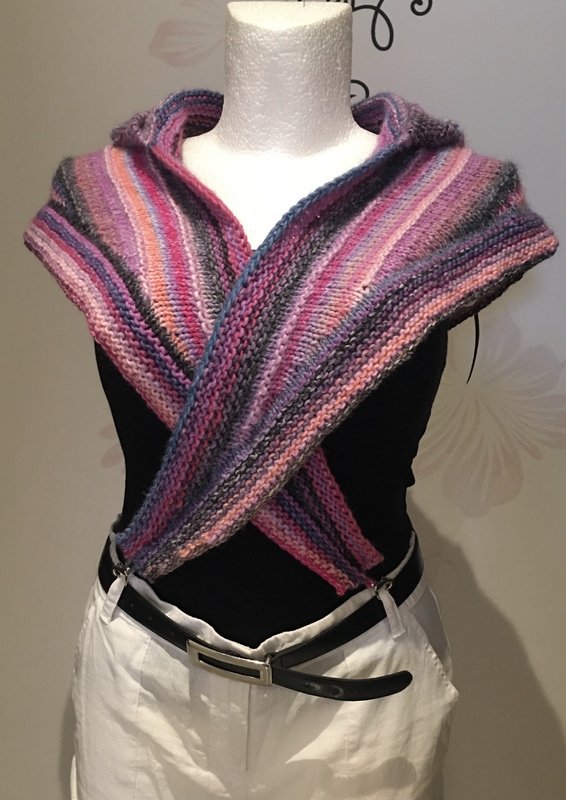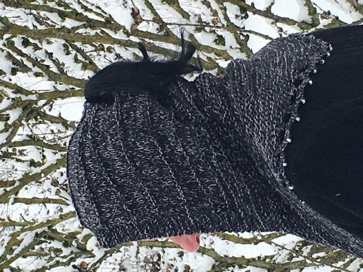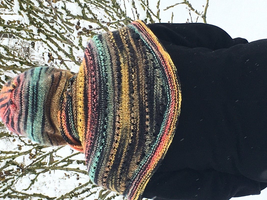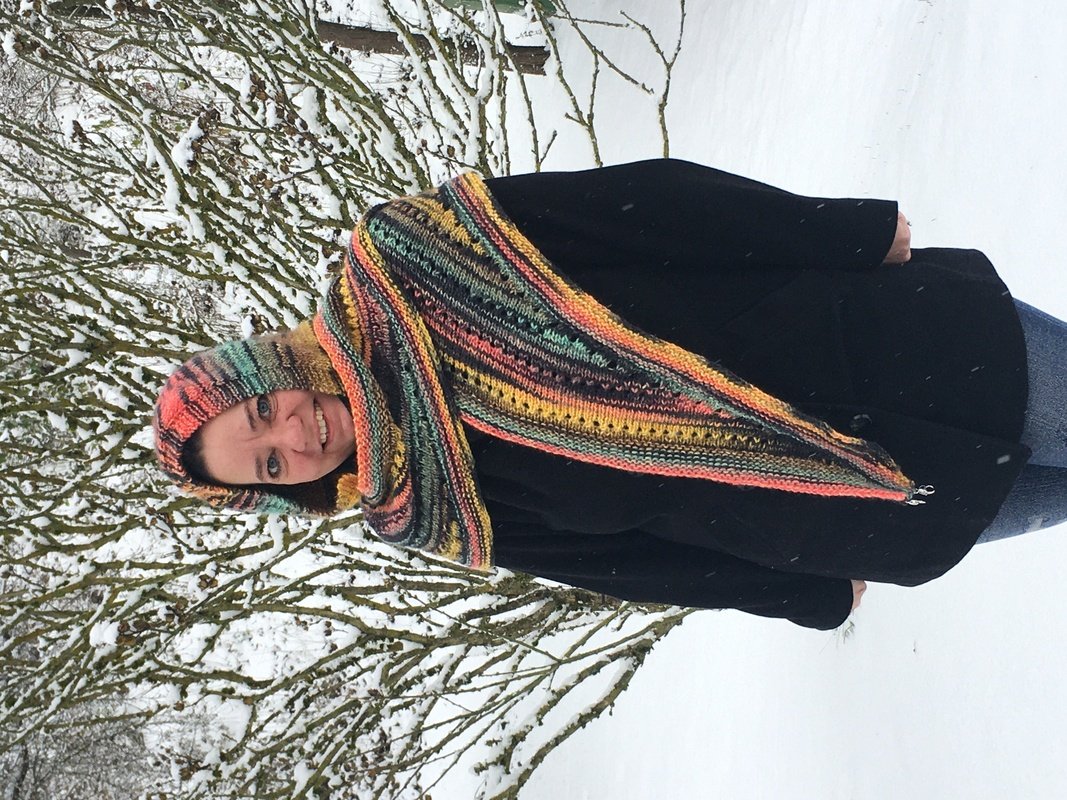 Die Formgebung der Kapuze wird durch „verkürzte“ Reihen erzielt. Das Tuch wird ebenfalls mit „verkürzten“ Reihen gestrickt.
