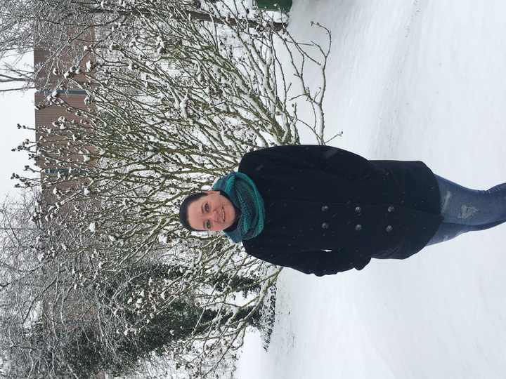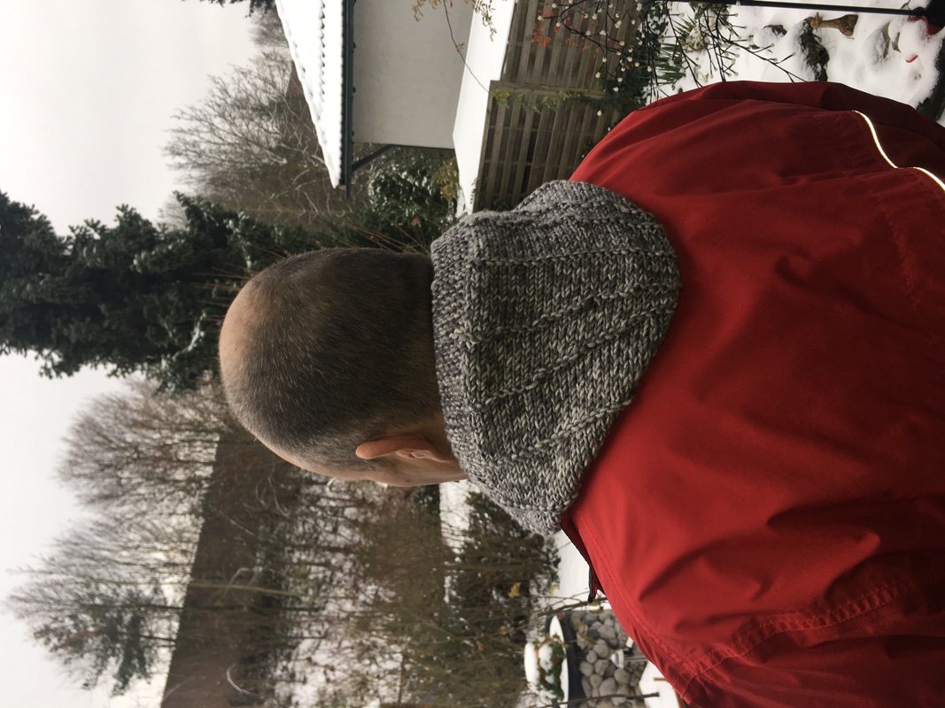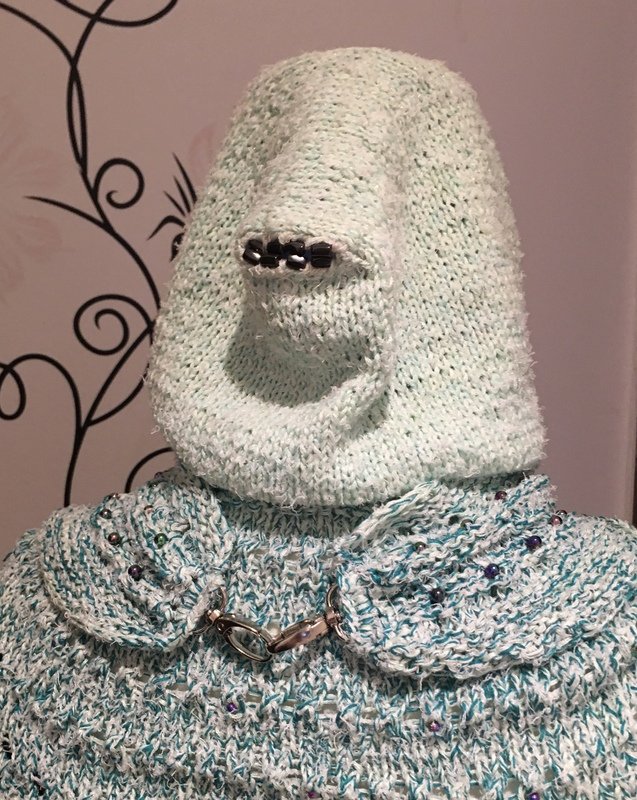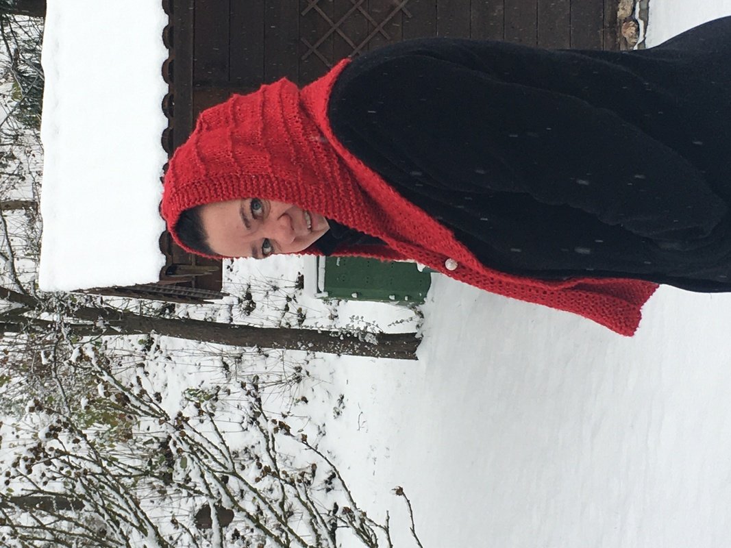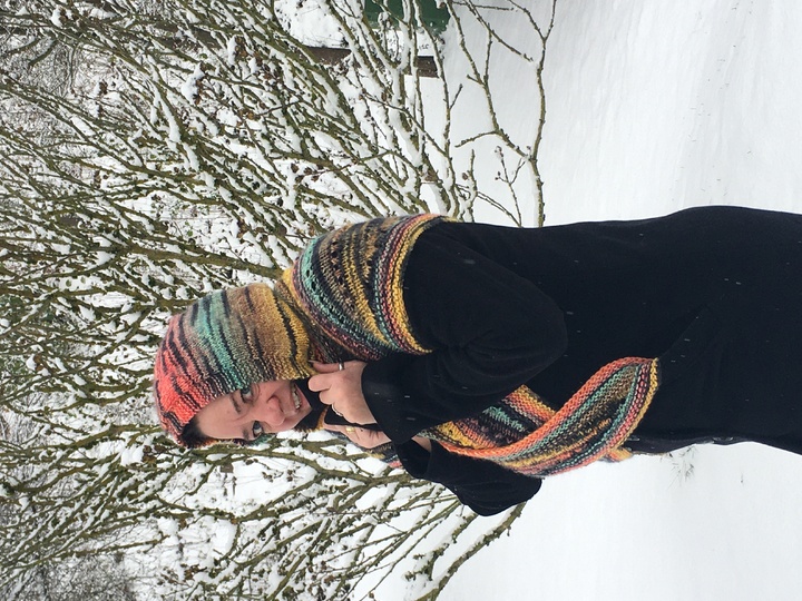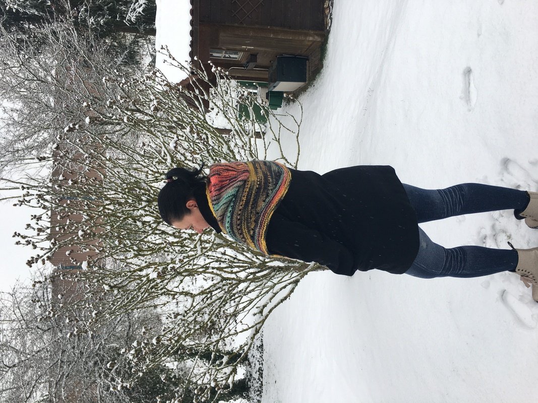 Eine Kapuze, die nicht zu groß ist und sich fast, wie eine Mütze an den Kopf kuschelt. Das Tuch legt sich wärmend um den Nacken und ist groß genug um ihn einmal um den Kopf zu wickeln.
