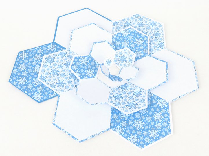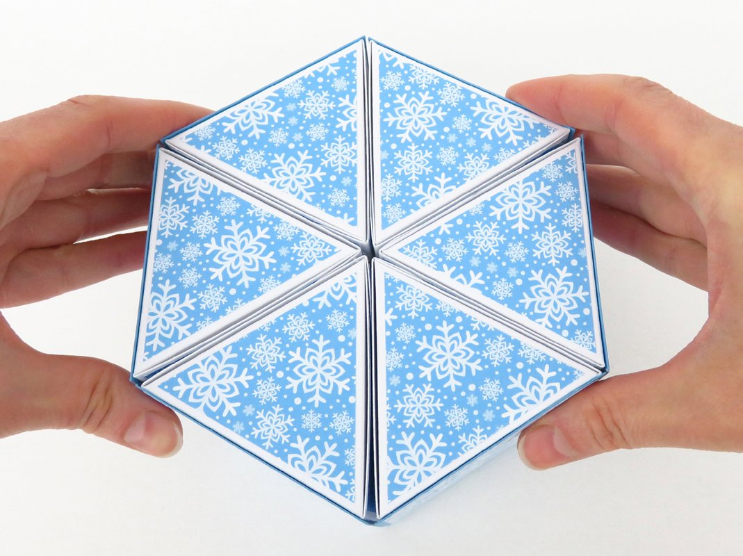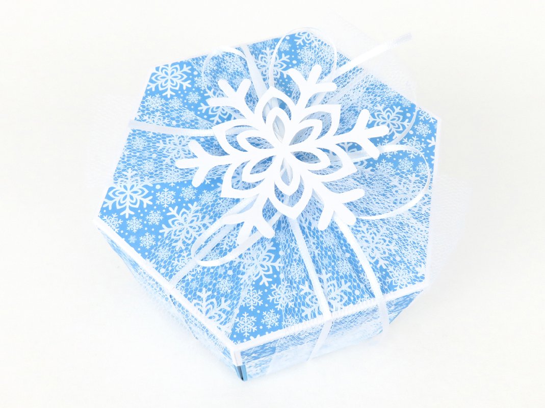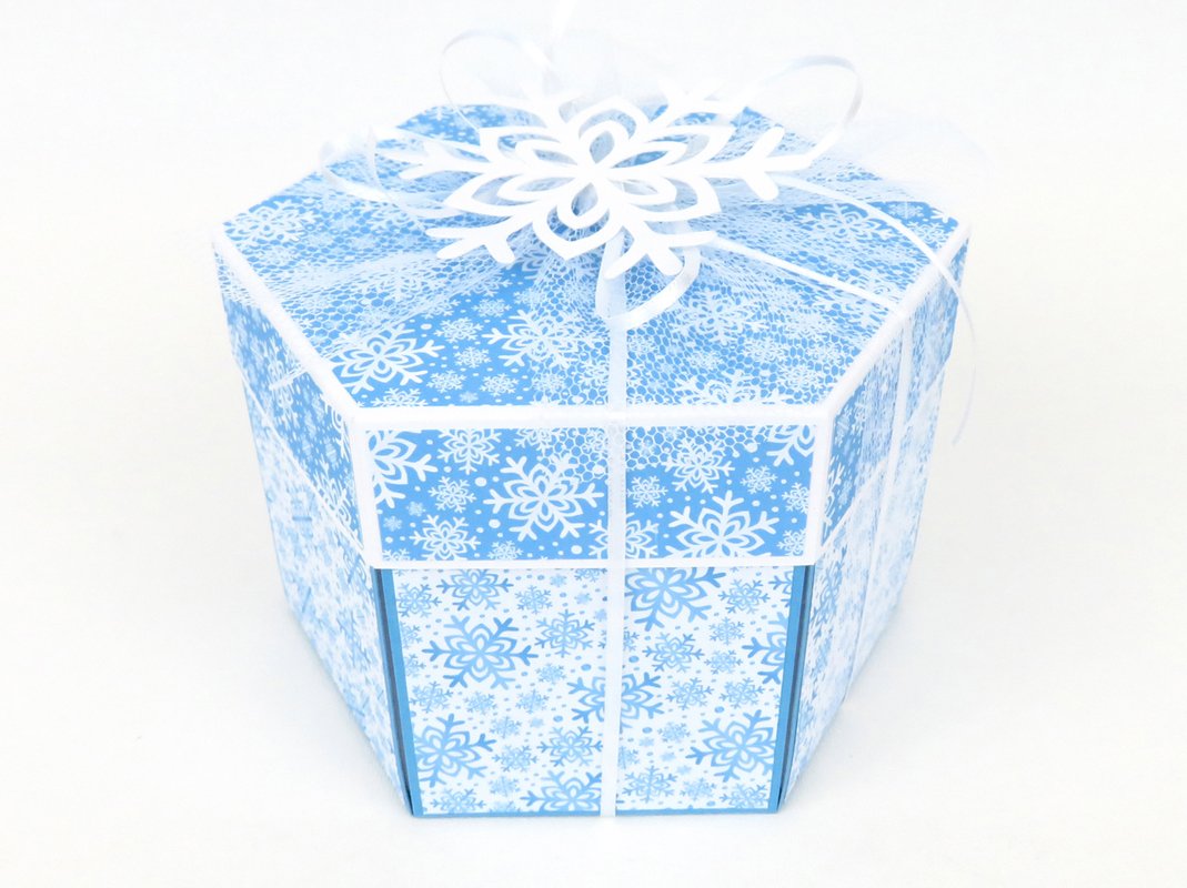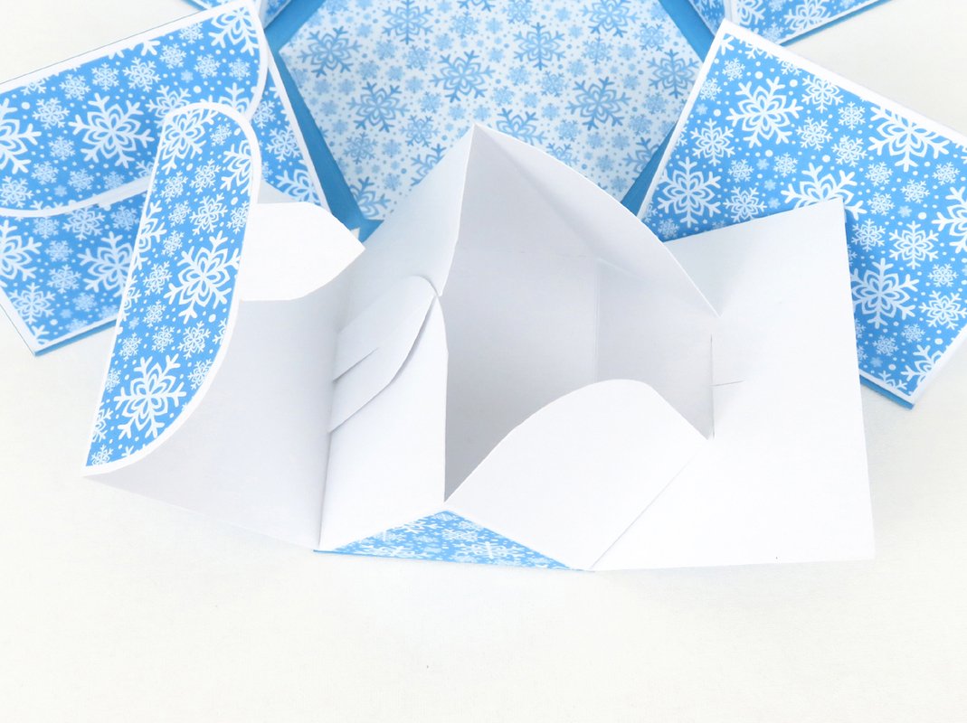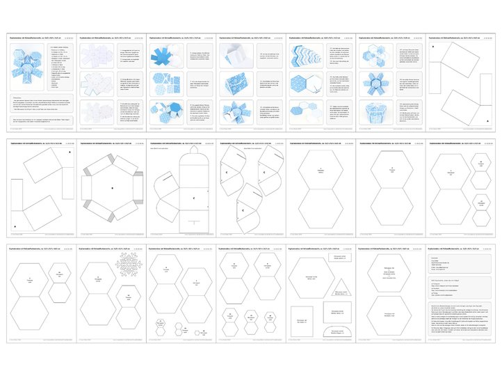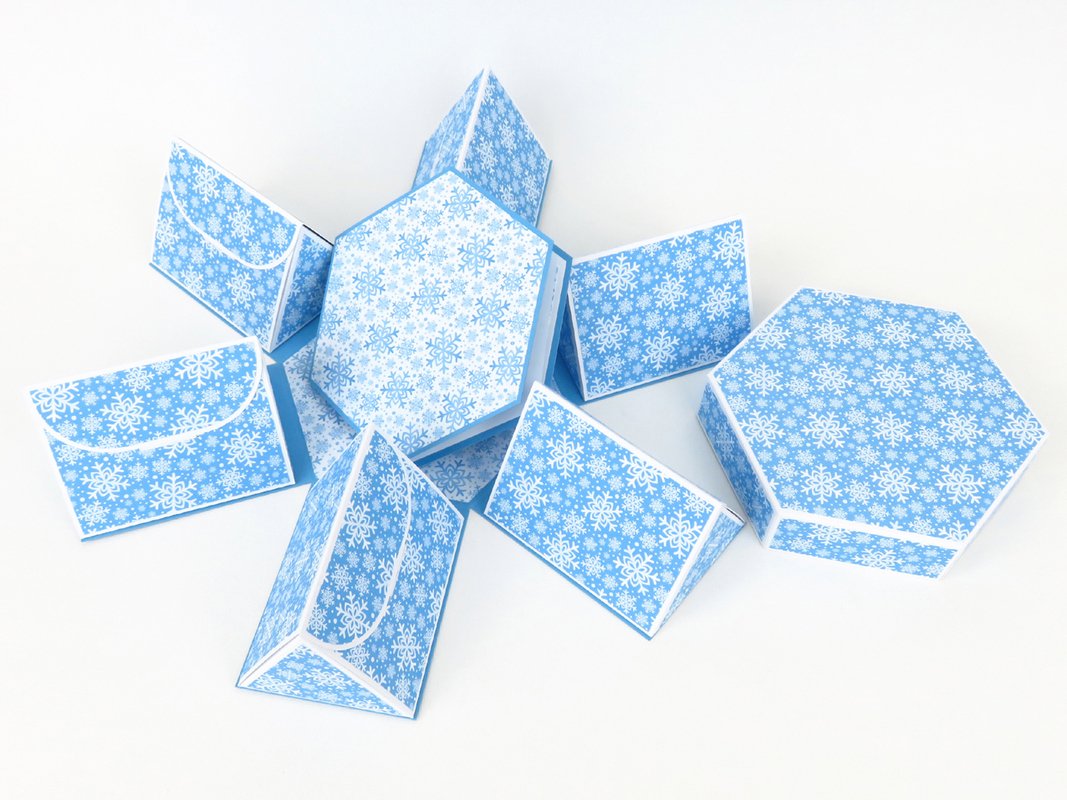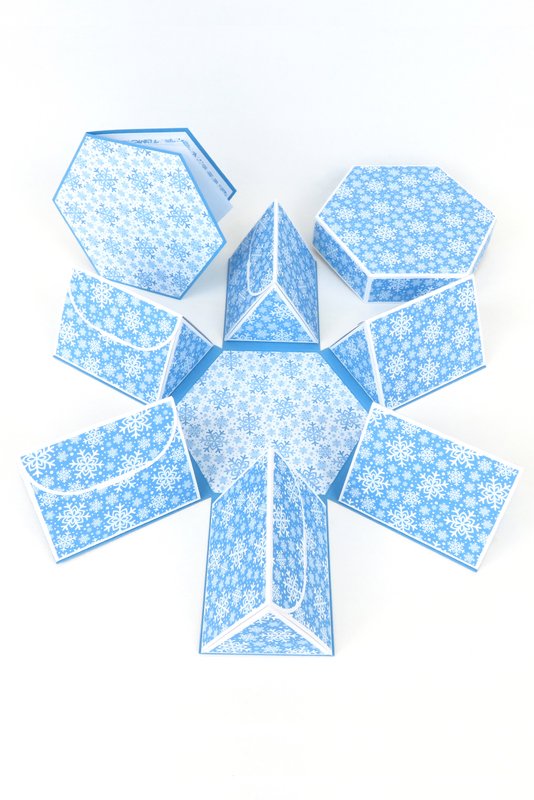 Eine hübsche Geschenkidee für Weihnachten und Winter: In dieser Box sind sechs kleine Behältnisse für Süßigkeiten oder andere kleine Geschenke sowie eine spiralförmige Faltkarte untergebracht. Die weißen Flächen der Karte können beschriftet oder mit weihnachtlichen Motiven bzw. Fotos beklebt werden. Natürlich kann auch diese Box durch geänderte Fotokartonfarben oder anderes Motivpapier jedem anderen Anlass angepasst werden.