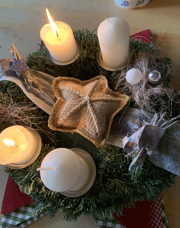 Wollereste, egal in welcher Qualität. Es geht Sockenwolle, aber auch eine stärkere Merinoqualität. Der Wollrest sollte nicht zu klein sein. Etwas Goldgarn, um den fertigen Stern zu umhäkeln, wer mag, braucht auch 7 Perlen, um den Stern zu verschönern, 1 Nadelspiel, Stärke passend zur Wollqualität (2,5 - 4), 1 Stopfnadel zum Vernähen der Fäden.