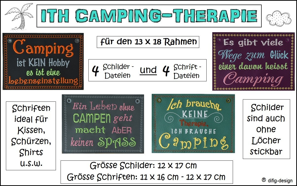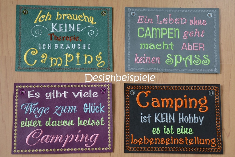 Vier ITH-Stickdateien Schilder für den 13x18 Rahmen mit Campingsprüchen.