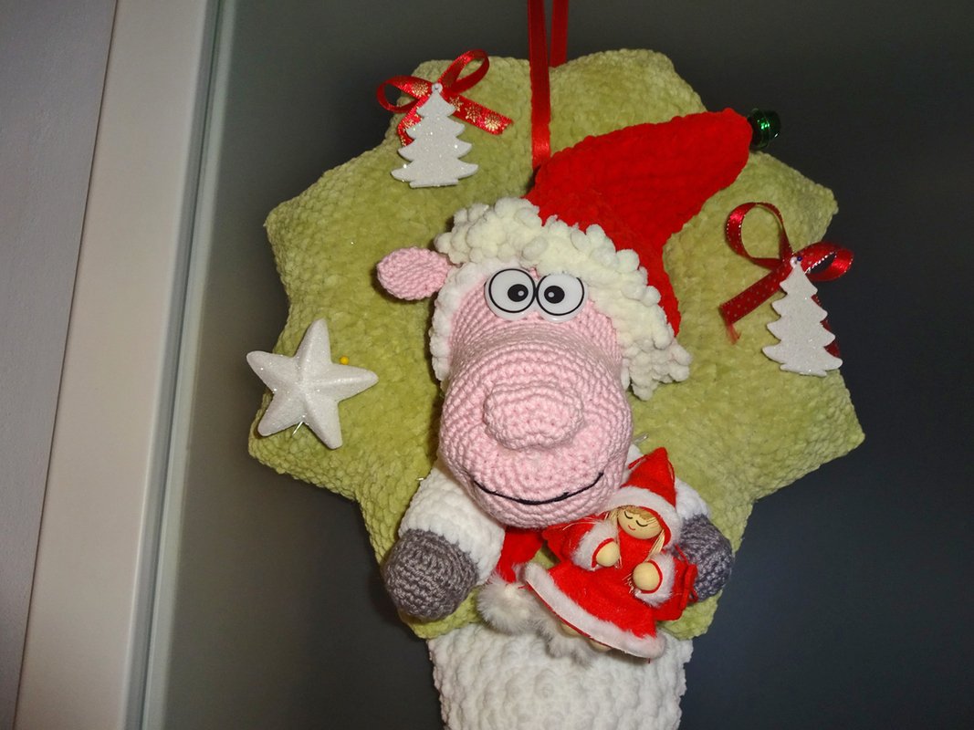 Das Schaf freut sich auf Weihnachten und heißt, als Türkranz, jeden Gast herzlich willkommen.