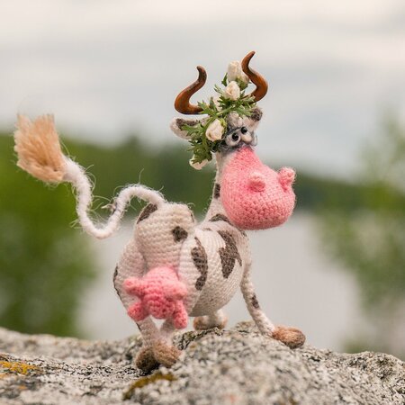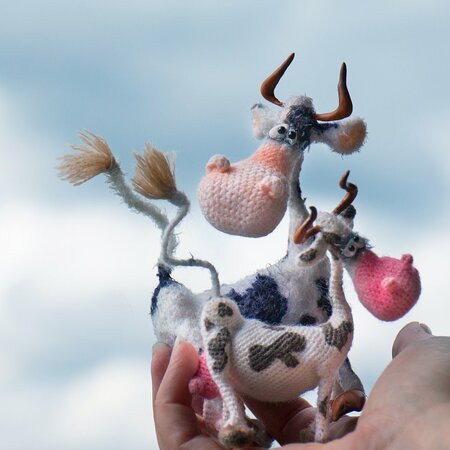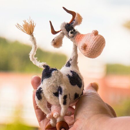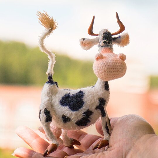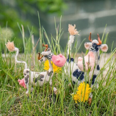 Sie können beliebiges mittelflauschiges Garn (Wolle, Acryl usw.) für die Hauptteile und beliebiges glattes Garn für das Mäulchen und das Euter verwenden. Je dicker das Garn, desto größer ist die Figur. Wenn Sie eine kleinere Kuh machen möchten, verwenden Sie das Garn mit der LL von 800 m auf 50 g