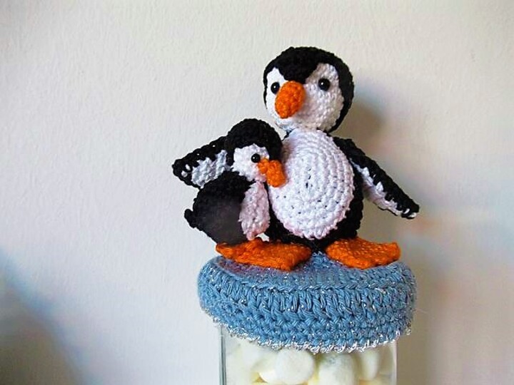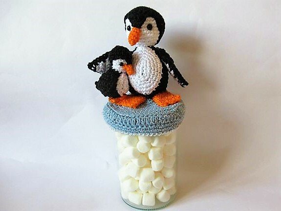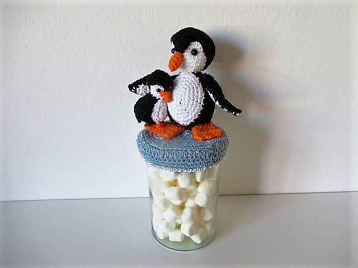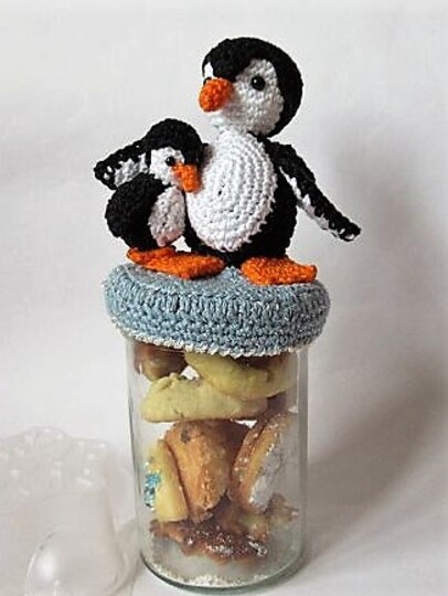 Aus einem leeren Marmeladengalas kannst du eine wunderschöne Geschenkverpackung z. B. für Süßigkeiten machen.Das Bonbonglas "Pinguinmama mit Baby" setzt deine selbstgebackenen Plätzchen oder Pralinen erst ins rechte Licht.