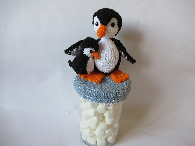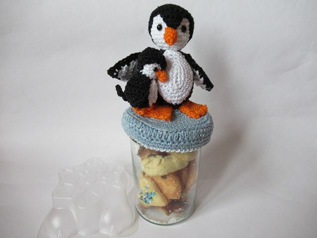 Das Marmeladenglas hat eine Durchmesser von etwa 9 cm. Die Pinguinmama ist etwa 15 cm groß.