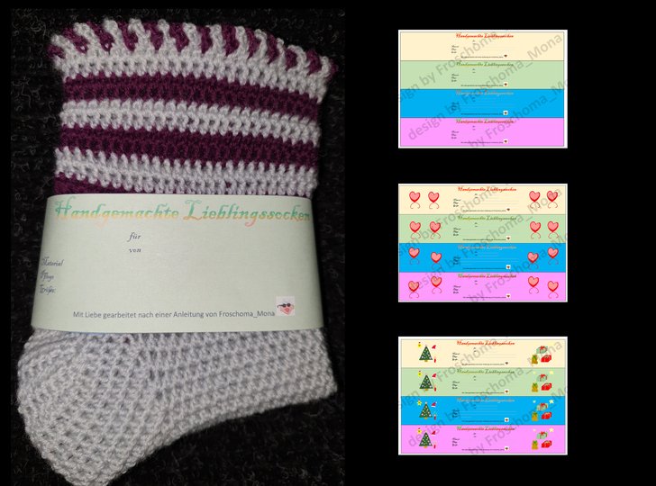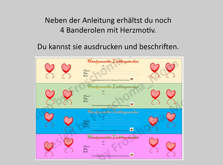 Falls du die fertigen Socken verschenken möchtest, erhältst du noch Sockenbanderolen in 4 verschiedenen Farben und 3 verschiedenen Ausführungen, insg. 12 Banderolen.