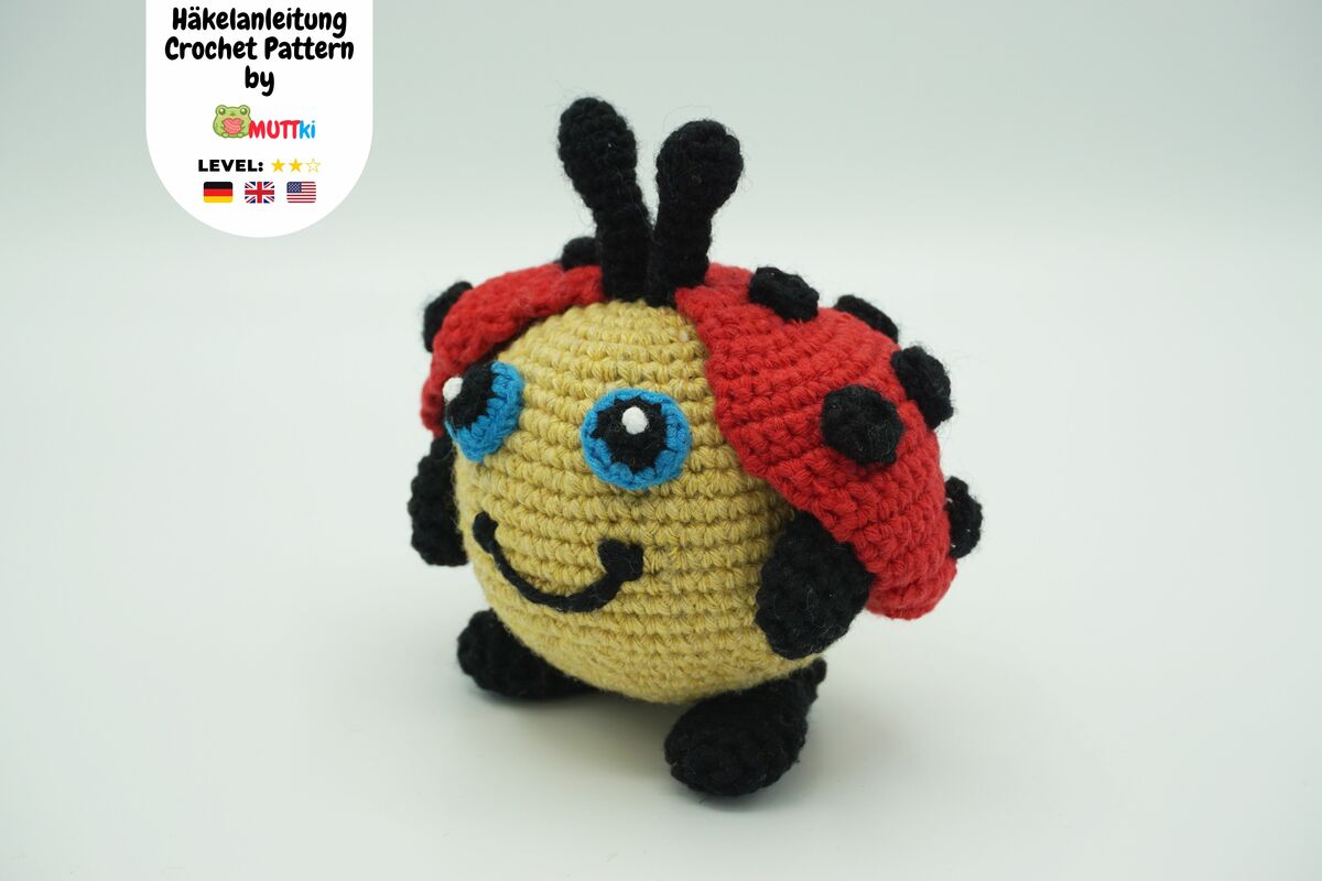 Eine Muki-Marienkäfer Häkelanleitung auf 4 bunten Seiten im PDF-Format zum selber Häkeln (jeweils in deutsch, amerikanisch, britisch).