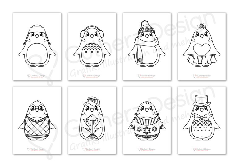 Das pdf enthält 9 Seiten, wovon 8 Seiten jeweils einen Pinguin zum Ausmalen beinhalten.