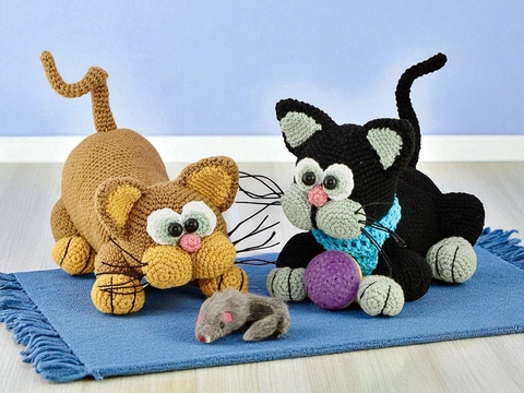 Die Größe des Kätzchens hängt vom verwendeten Garn ab. Meine Kätzchen, die ich mit Schachenmayr Catania originals gehäkelt habe, sind ca. 12 cm hoch. Wenn ich stattdessen Schöller & Stahl Record 210 verwende, erreicht es eine Höhe von ca. 17 cm. Schön plüschig werden eure Kätzchen, wenn ihr das Bravo Softy Garn von Schachenmayr verwendet, sie erreichen dann eine Höhe von ca. 14 cm.