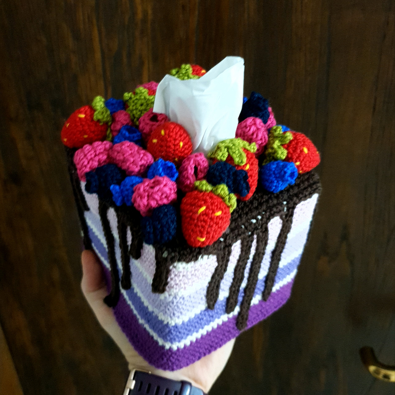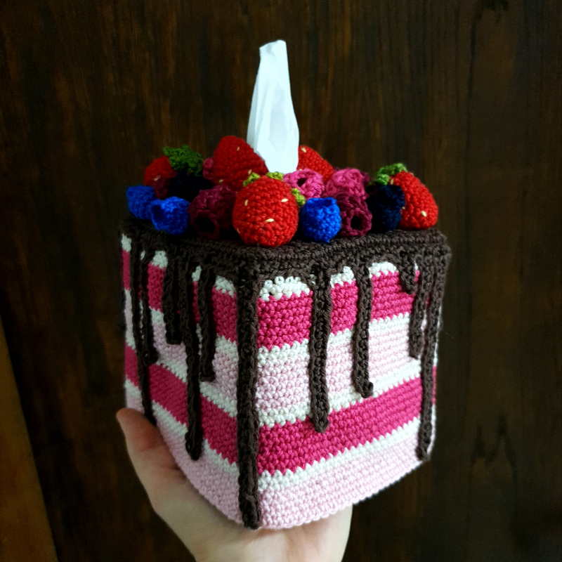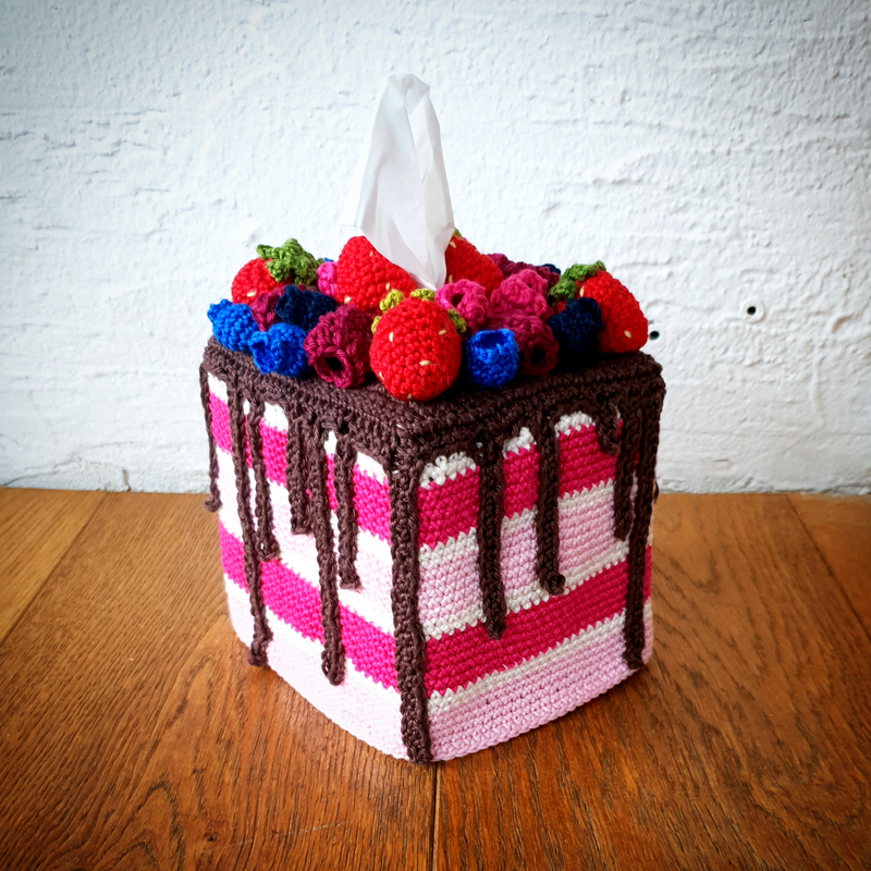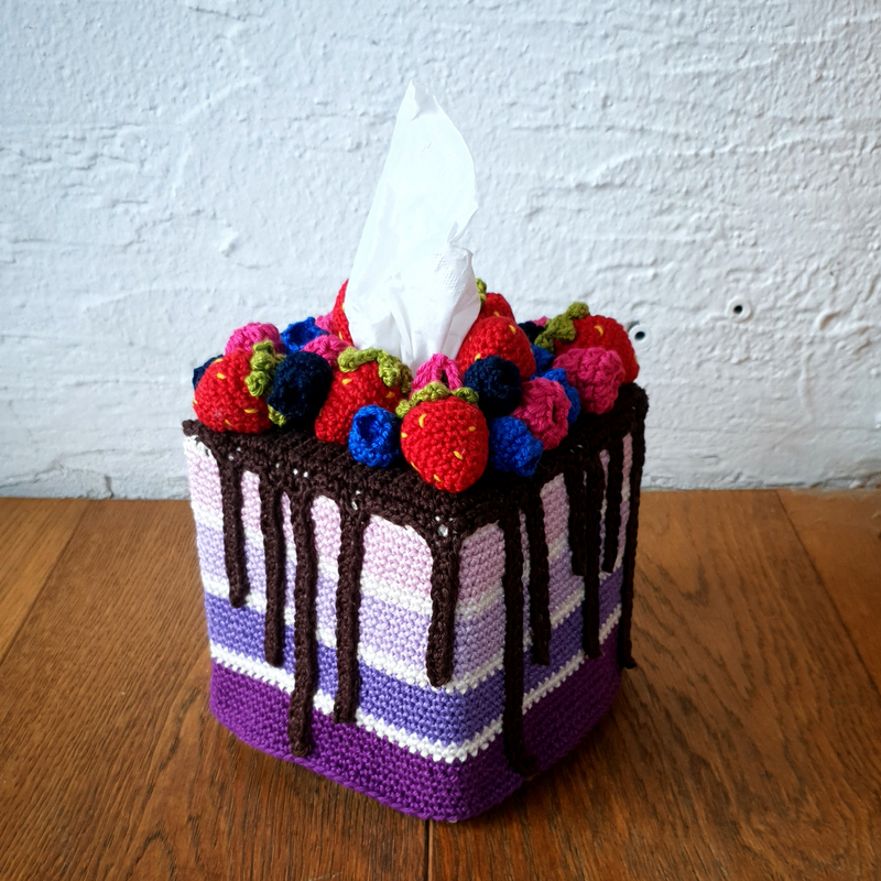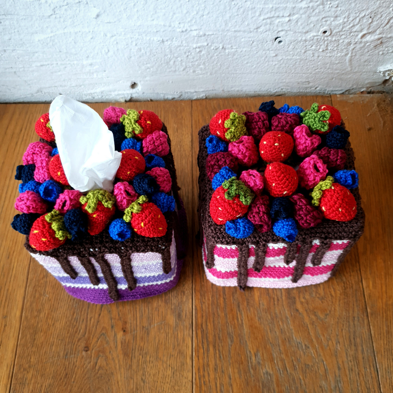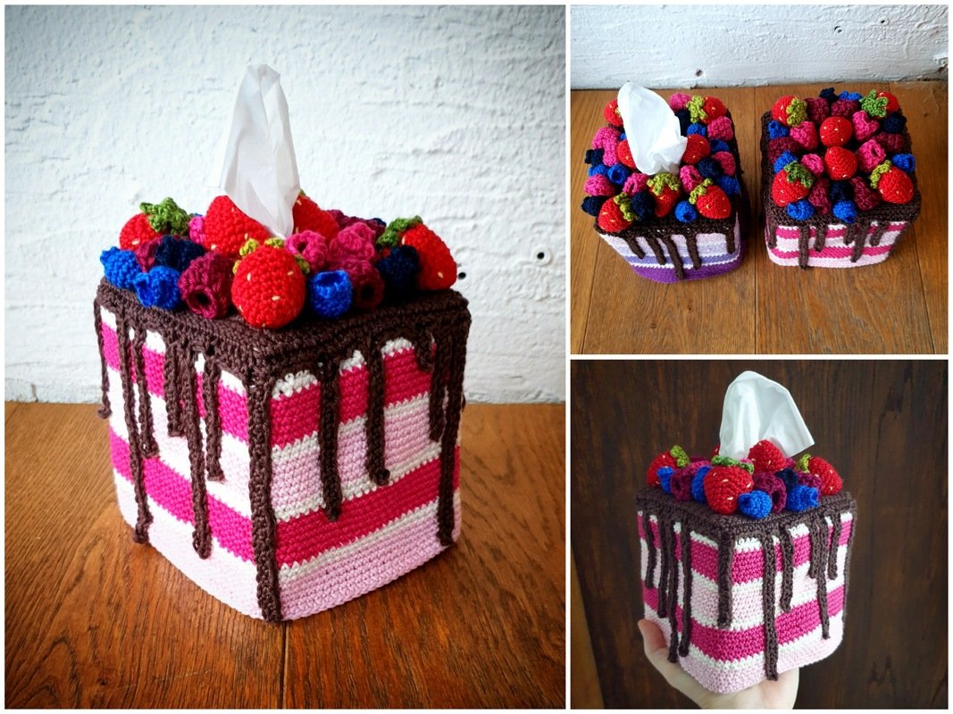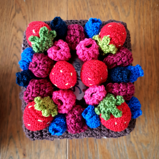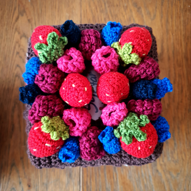 Dies ist eine Häkelanleitung für eine Taschentuchboxhülle mit verschiedenem Obst (Erdbeeren, Himbeeren, Blaubeeren) von ChiChi Marie