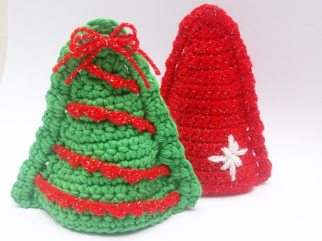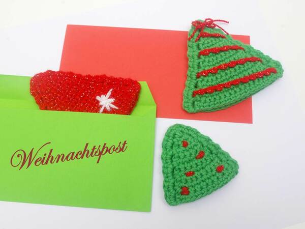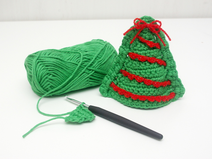 Die endgültige Größe ist je nach Garn, Nadelstärke und Häkelfestigkeit verschieden. Das grüne Bäumchen mit der Girlande hat eine Größe von ca. 11 cm.