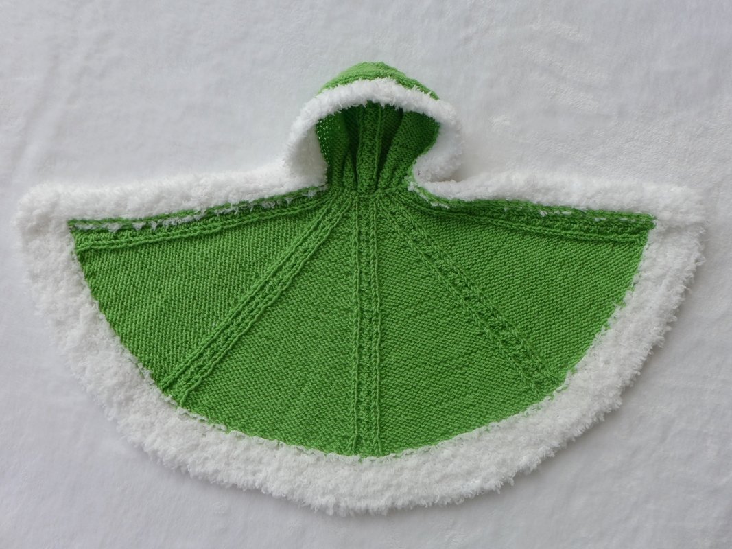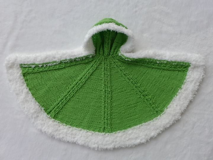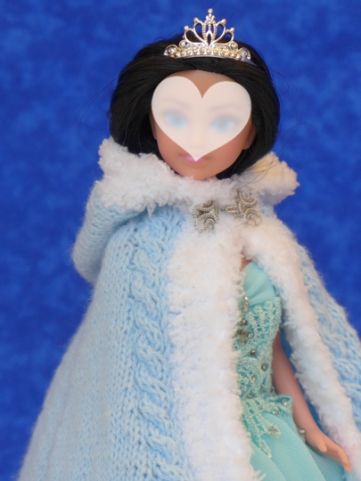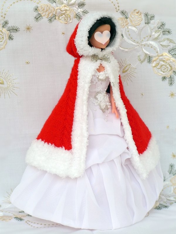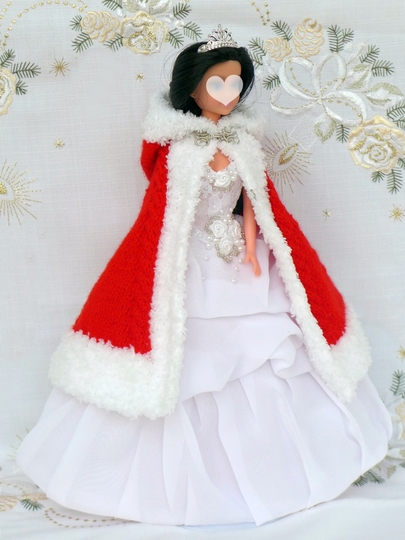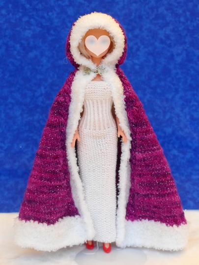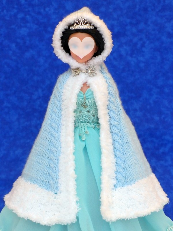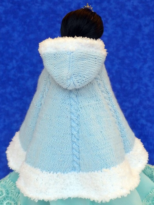 Dieses hier ist gestrickt und hat eine schöne große Kapuze und einen breiten weißen Saum rundherum. Von der Länge her ist es variabel und wird am Hals mit einem Schmuckverschluss geschlossen. Nach unten hin fällt es offen, so dass man auch das schöne Kleid darunter noch sehen kann. In dieser Kleidung ist die Puppe sicherlich die Schönste auf dem Ball und wird den Prinzen verzaubern :-)